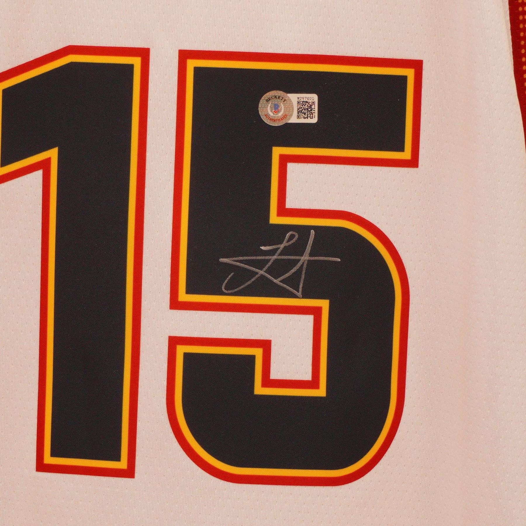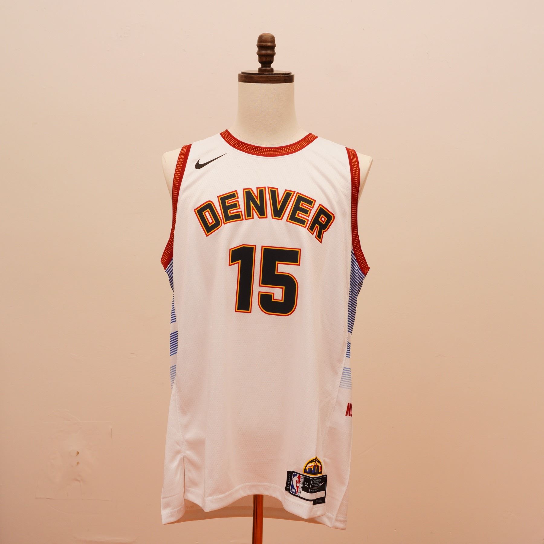 White Denver Nuggets Nike basketball jersey featuring the number 15 and JOKIC lettering on the back, personally signed by Nikola Jokic in silver ink. The signature is prominently placed on the number and includes a Beckett Authentication hologram on the jersey for verification. The jersey showcases the team's distinctive color trim and official NBA and Nike branding, presented in excellent condition and housed in protective wrapping. A highly collectible piece celebrating one of basketball's most dominant players.
