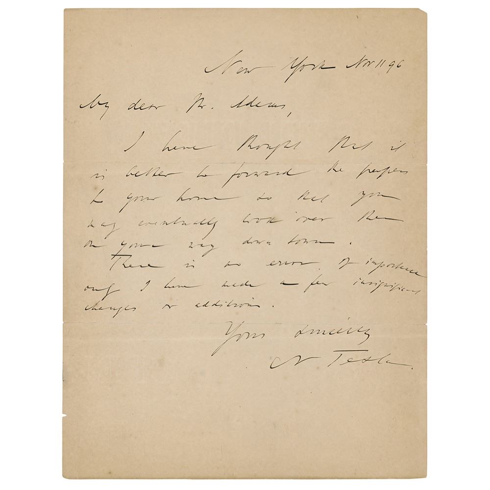 ALS signed “N. Tesla,†one page, 8.5 x 11, November 11, 1896. Handwritten letter to "Mr. Adams," in full: "I have thought that it is better to forward the papers to your home so that you may eventually look over them on your way down town. There is no error of importance only I have made a few insignificant changes or additions." In fine condition, with splitting to the ends of the two mailing folds. Accompanied by a 1973 letter from the Heritage Bookshop in Hollywood, offering the Tesla letter for sale.