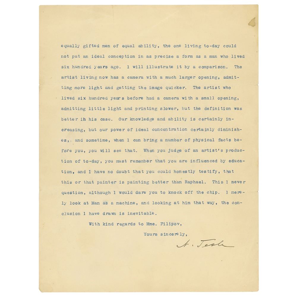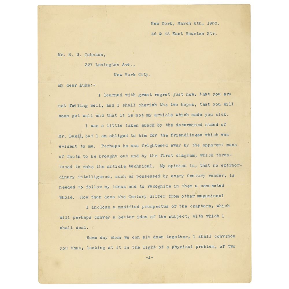 TLS signed “N. Tesla,†two pages, 8 x 10.5, March 6, 1900. Letter to Robert Underwood Johnson, editor of The Century Magazine. In part: "I learned with great regret just now, that you are not feeling well, and I shall cherish the two hopes, that you will soon get well and that it is not my article which made you sick. I was a little taken aback by the determined stand of Mr. Buell, but I am obliged to him for the friendliness which was evident to me. Perhaps he was frightened away by the apparent mass of facts to be brought out and by the first diagram, which threatened to make the article technical. My opinion is, that no extraordinary intelligence, such as possessed by every Century reader, is needed to follow my ideas and to recognize in them a connected whole. How then does the Century differ from other magazines? I inclose a modified prospectus of the chapters, which will perhaps convey a better idea of the subject, with which I shall deal. Some day when we can sit down together, I shall convince you that, looking at it in the light of a physical problem, of two equally gifted men of equal ability, the one living to-day could not put an ideal conception in as precise a form as a man who lived six hundred years ago. I will illustrate it by a comparison. The artist living now has a camera with a much larger opening, admitting more light and getting the image quicker. The artist who lived six hundred years before had a camera with a small opening, admitting little light and printing slower, but the definition was better in his case. Our knowledge and ability is certainly increasing, but our power of ideal concentration certainly diminishes, and sometime, when I can bring a number of physical facts before you, you will see that. When you judge of an artist's production of to-day, you must remember that you are influenced by education, and I have no doubt that you could honestly testify, that this or that painter is painting better than Raphael. This I never question, although I would date you to knock off the chip. I merely look at Man as a machine, and looking at him that way, the conclusion I have drawn is inevitable." In fine condition, with light creasing, a short tear to the top edge of each page, and a small stain to the second page.