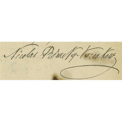 <B>Nikolai Rimsky-Korsakov Letter Signed</B></I> Manuscript LS: "<I>Nicolas Rimsky-Korsakow,</B></I>" in French, 1.5 pages, separate conjoined leaves, 4.25" x 6.75 inches. St. Petersburg, December 31, 1907, to Gallois and Demogerot in Paris. The Russian composer writes, in part, that "<I>it is not necessary to send me, at this moment, the cuts which you have,</B></I>" but they may write to him again in the future. Rimsky-Korsakov's works include "Scheherazade," "Song of India," and "The Flight of the Bumblebee." Burn marks on both pages result in a half-inch hole in the lower right of the second leaf. Light staining at "Korsakow". Overall, in very good condition.