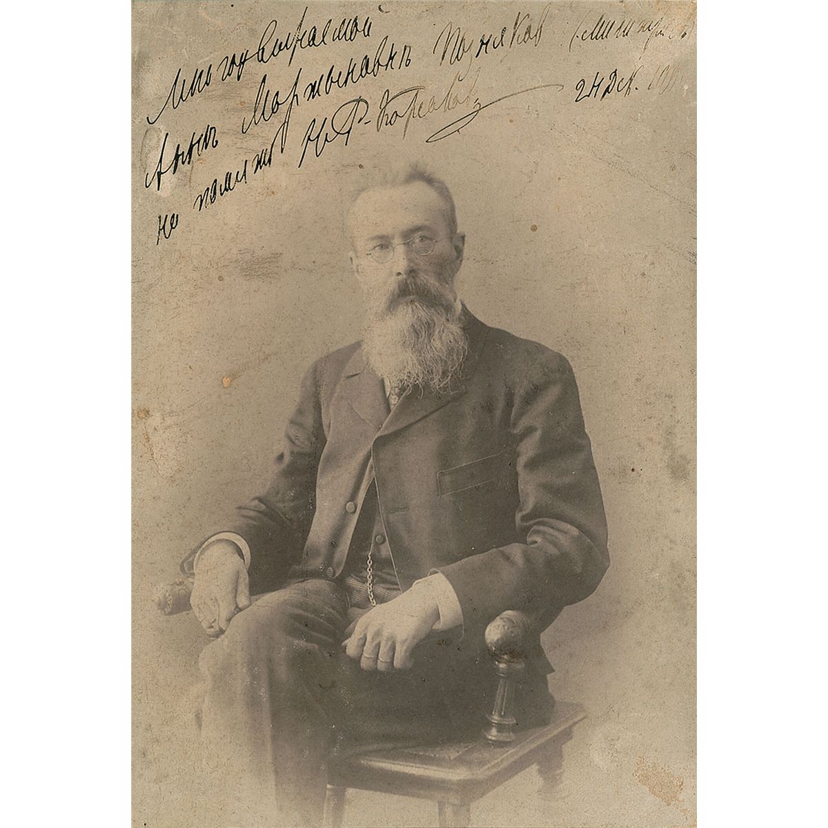 Eminent Russian composer (1844–1908) best known for such brilliantly orchestrated works as Scheherazade and for operatic staples like ‘Sadko,’ ‘The Tale of Tsar Saltan,’ and ‘The Golden Cockerel.’ Original 4 x 5.5 cabinet photo of the composer seated in a wooden chair, inscribed in black ink, in Russian, signed “N. R.-Korsakov,” and dated December 1906. Matted to an overall size of 6 x 8.25. In fine condition, with end of signature and date light but legible due to decreased ink flow. The controversial opera’s premiere was delayed until after Rimsky-Korsakov’s death, as it was critical of the monarchy and Russo-Japanese War.