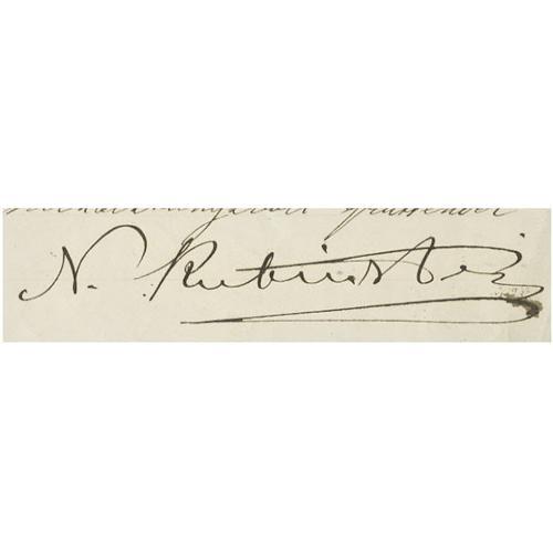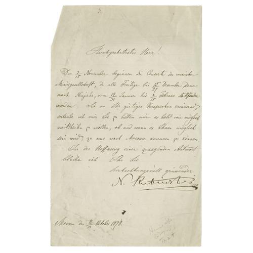 <B> Nikolai and Anton Rubinstein Pair of Autograph Letters Signed. </B></I> This lot contains two letters, one written by Anton, and the other by Nikolai. Letter 1 (Anton): One page, 5" x 8", personal letterhead, Riga, Latvia, October 14th, 1869. The letter is written in German; the content is routine. Anton signs himself, <I> "Ant. Rubinstein." </B></I> <r Letter 2 (Nikolai): One page, 5.25" x 8.25", Moscow, October 2nd, 1898. This letter is also in German, the content discusses an upcoming concert featuring Russian musicians and composers. Nikolai signs himself, <I> "N. Rubinstein." </B></I> Both Rubinstein brothers were extremely gifted; Anton was a great composer, and Nikolai was a great pianist. <r The letters are both in very fine condition; usual folds are present on both; Nikolai's letter has several creases on the corners and dark scuff marks on the lower left edge. From the Henry E. Luhrs Collection. Accompanied by LOA from PSA/DNA.