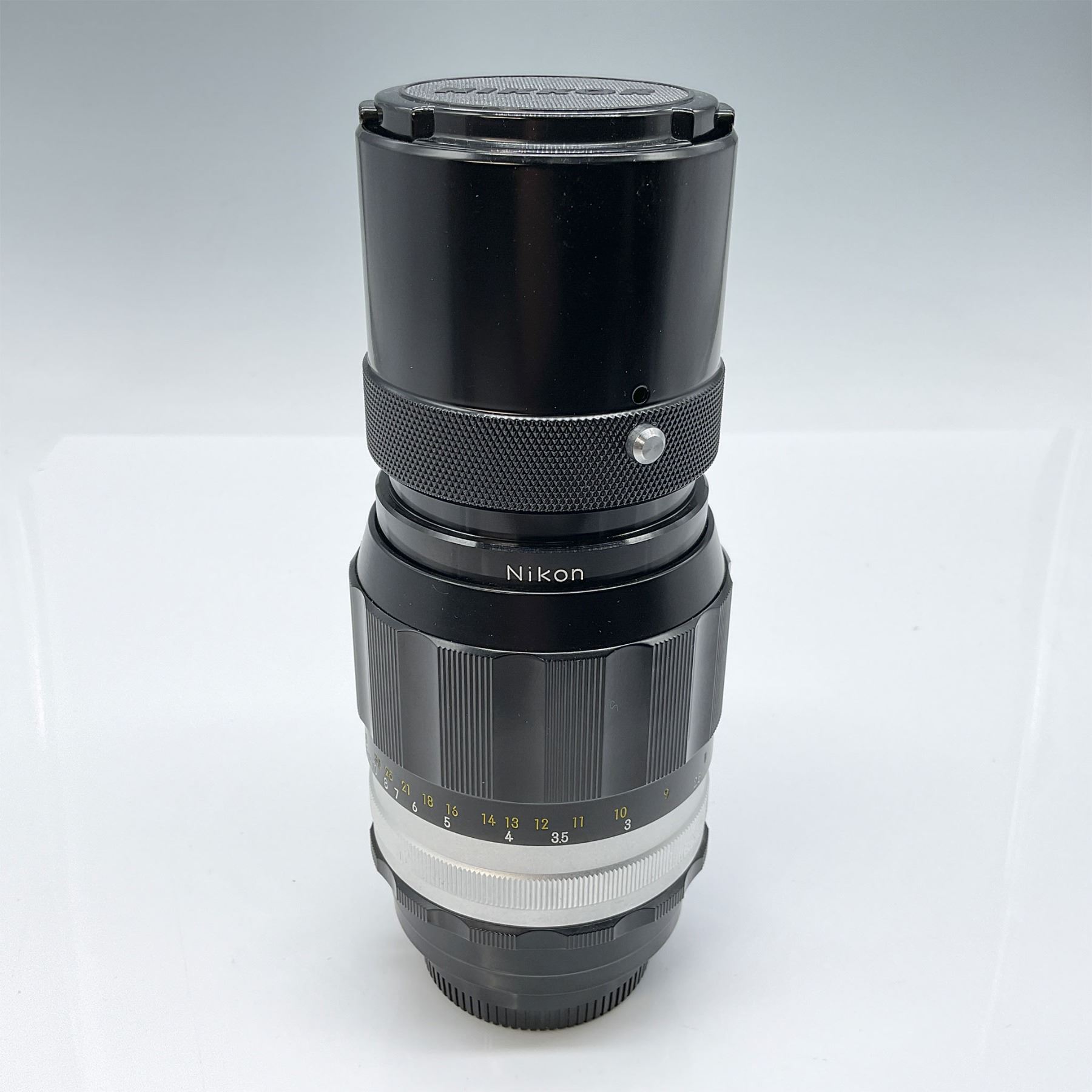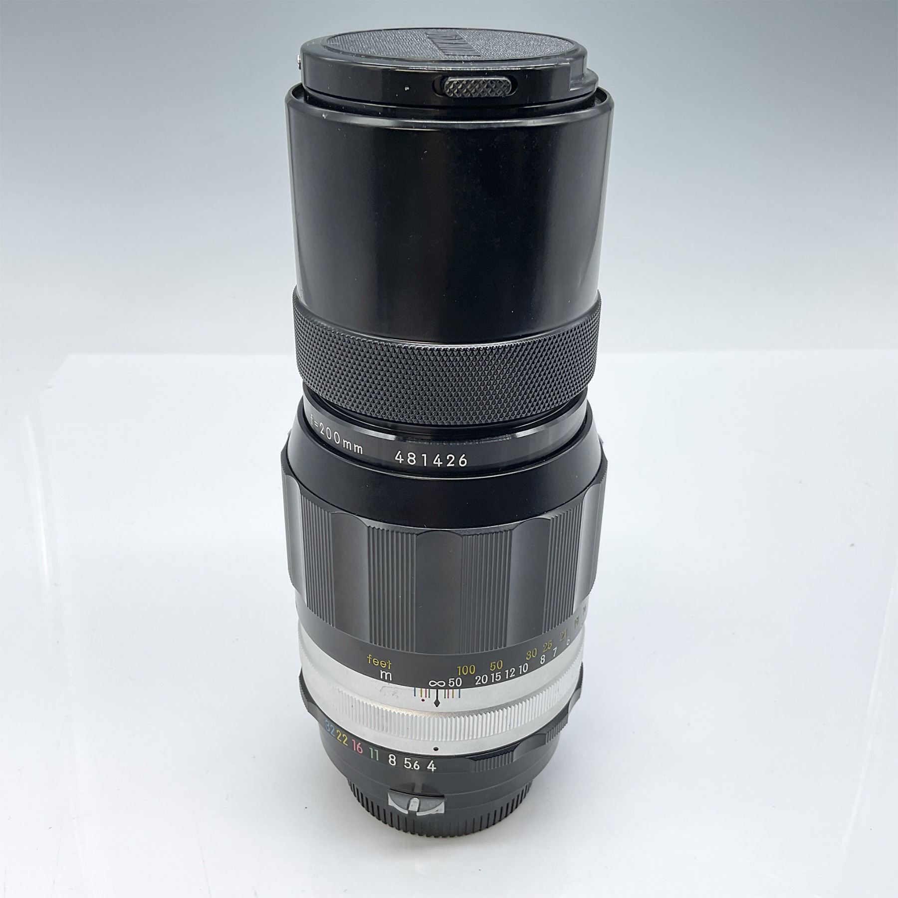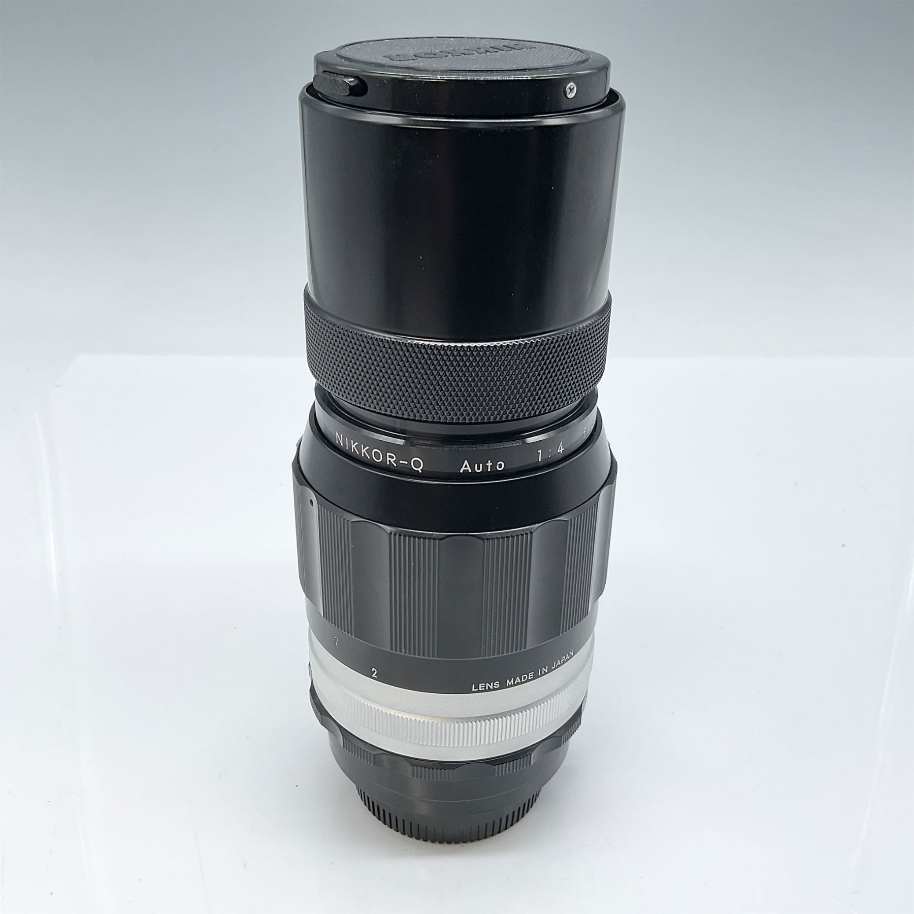 This Nikon 200mm f/4 NIKKOR-Q Auto manual focus telephoto lens is a classic addition for collectors or photographers. Manufactured in Japan, it features a durable metal construction with a 7.5-inch height when fully extended. The lens has a maximum aperture of f/4 and is designed for precise manual focusing. It includes front and rear lens caps for added protection. Serial number 481426.