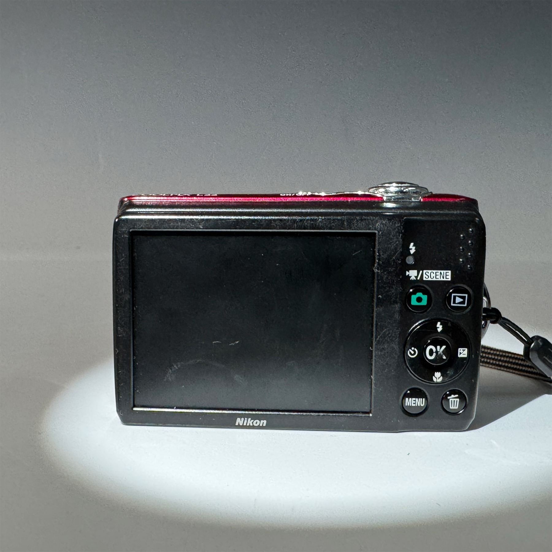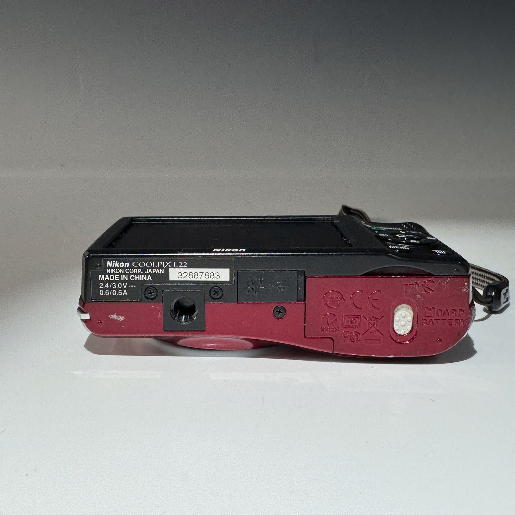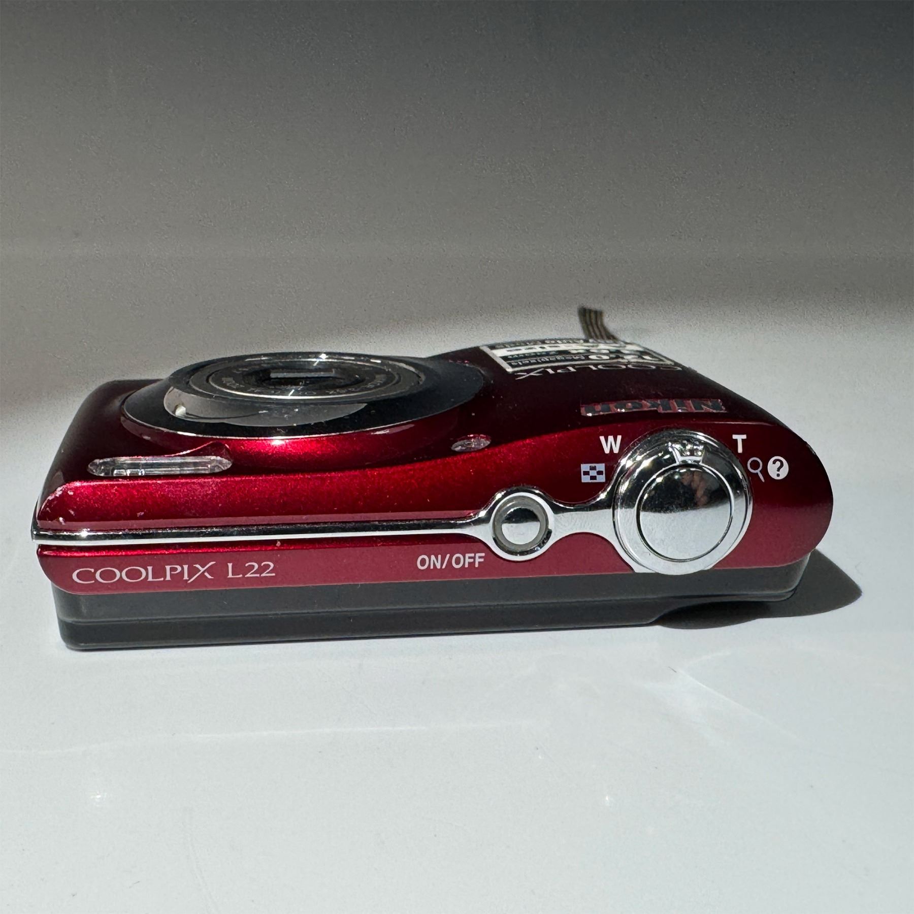 A Nikon Coolpix L22 digital camera, featuring a 12.0-megapixel sensor and a 3.6x zoom lens. This compact and lightweight model, finished in a striking red design, offers "Easy Auto Mode" for simplified operation. It includes a hand strap for convenience and portability.