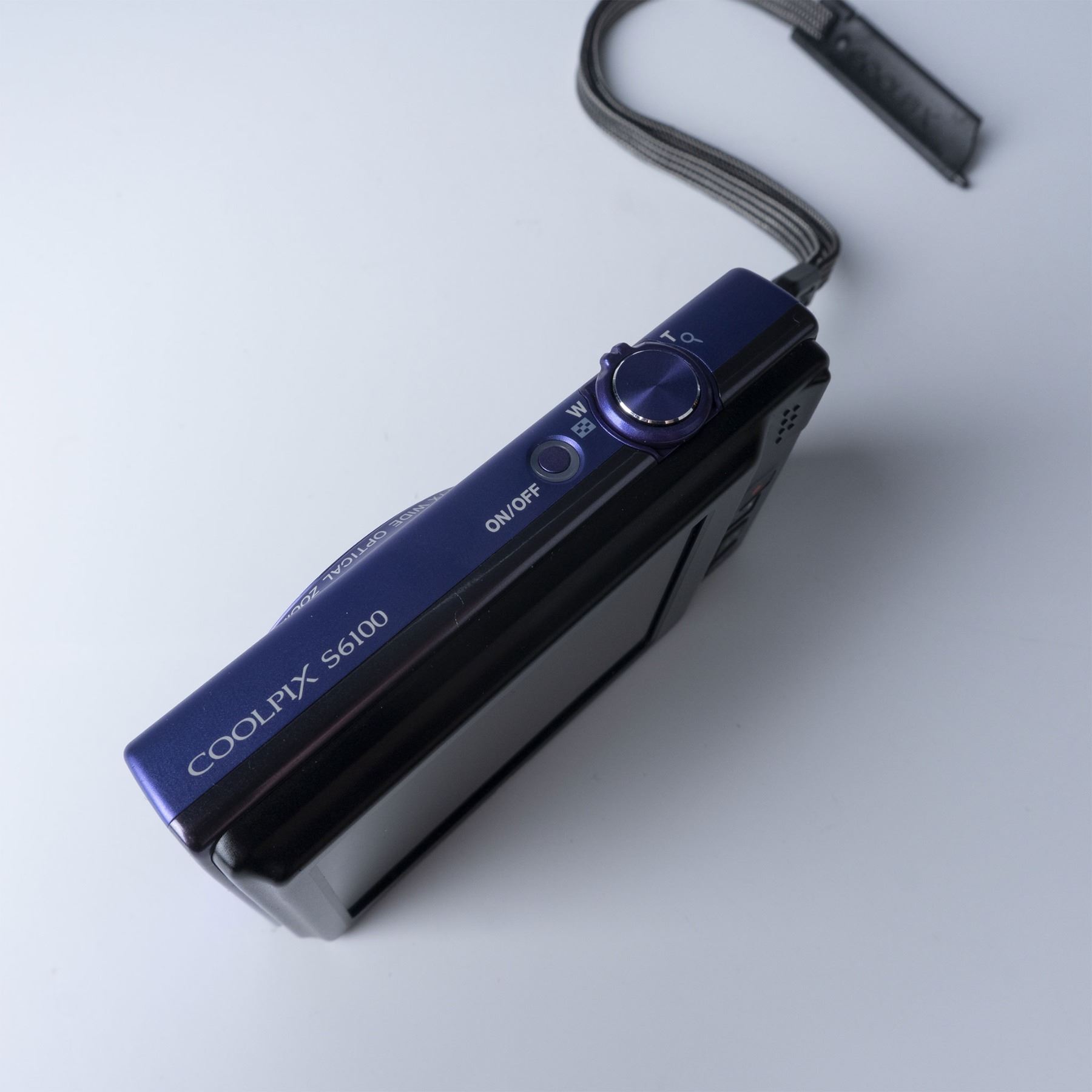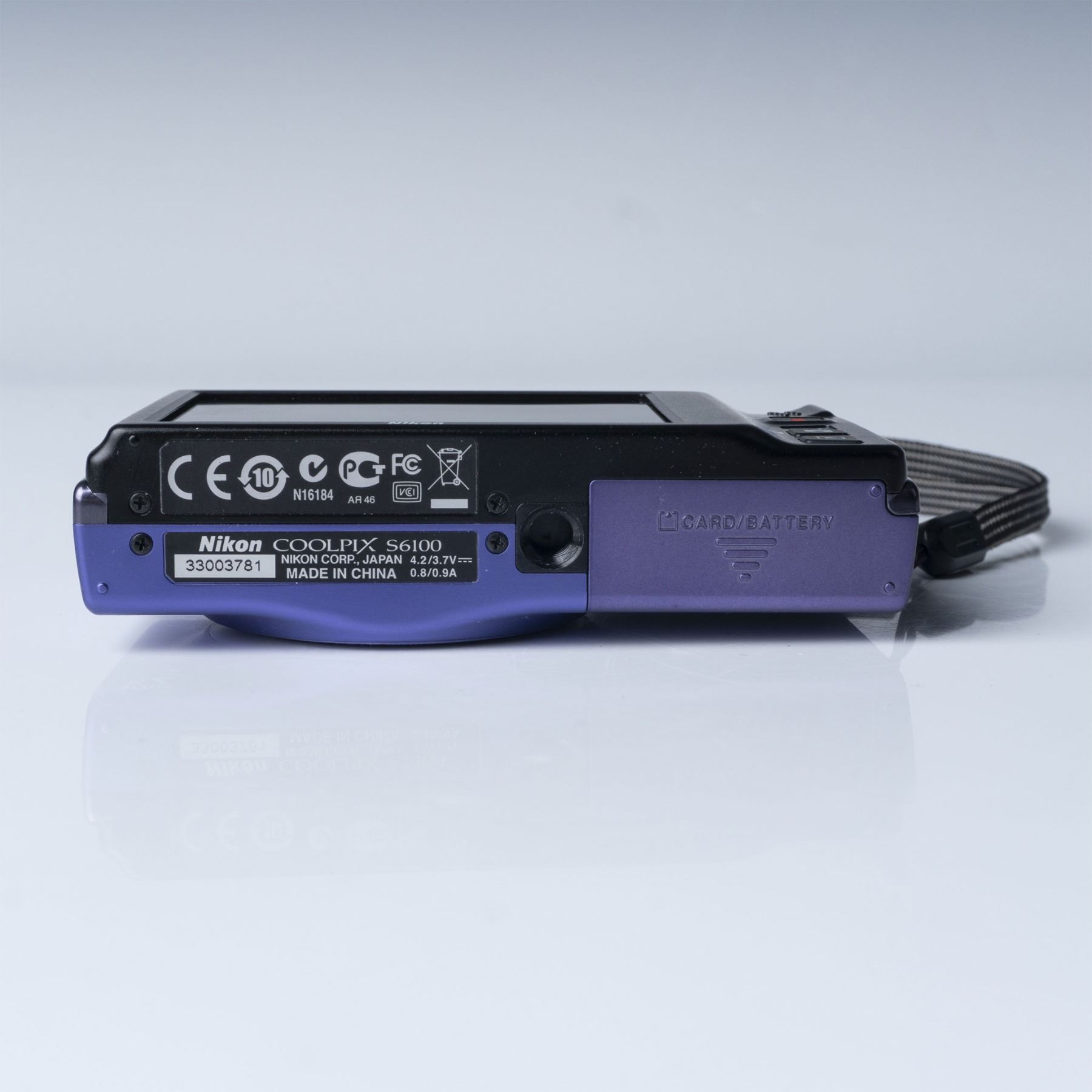 Nikon Coolpix S6100 digital camera featuring a 16-megapixel resolution, 7x wide optical zoom NIKKOR lens with ED VR (Vibration Reduction) technology, and a sleek purple finish. Designed for compact portability, this camera is equipped with a touchscreen display, HD video recording capabilities, and advanced scene modes. Marked on the base with "Nikon Coolpix S6100" along with manufacturing details.