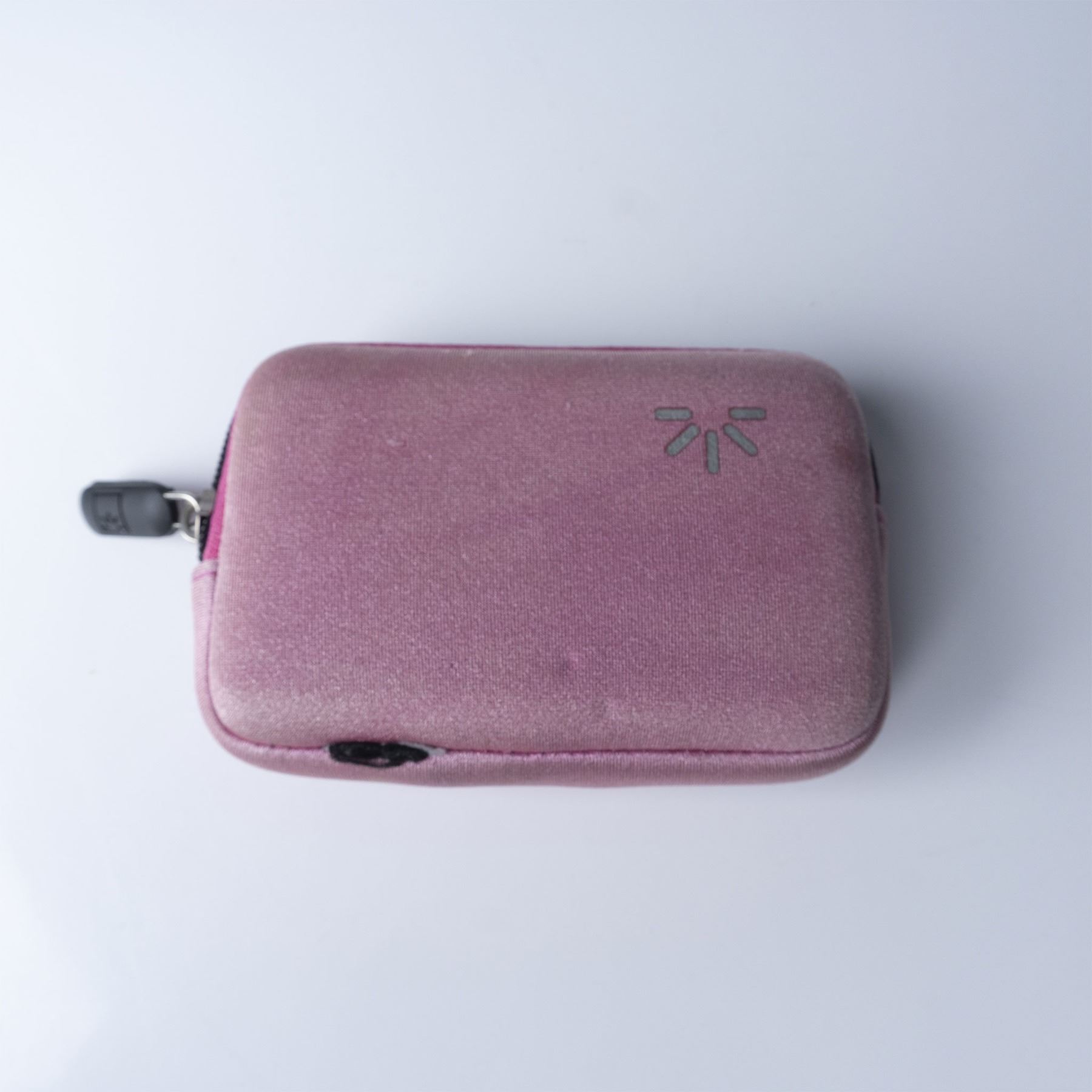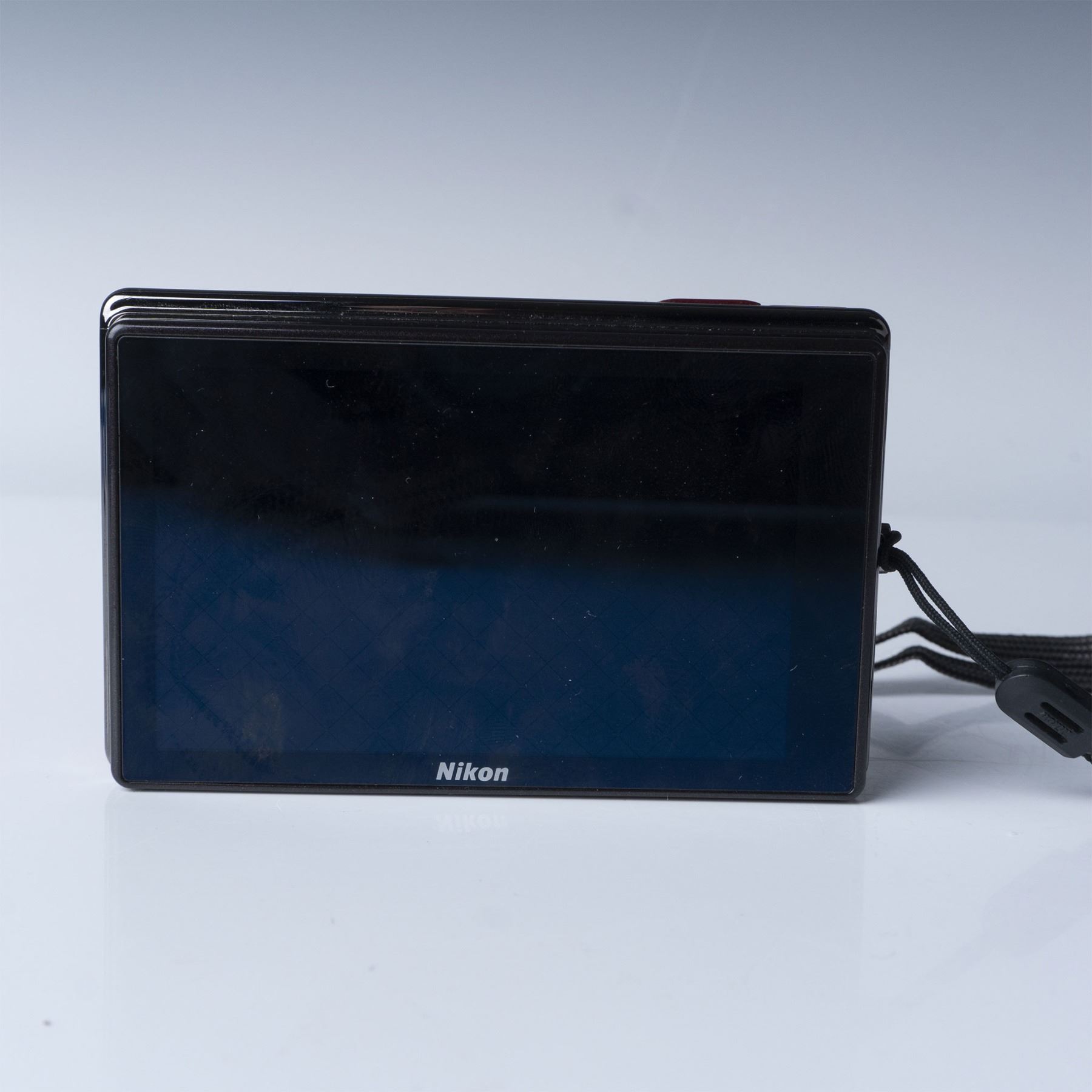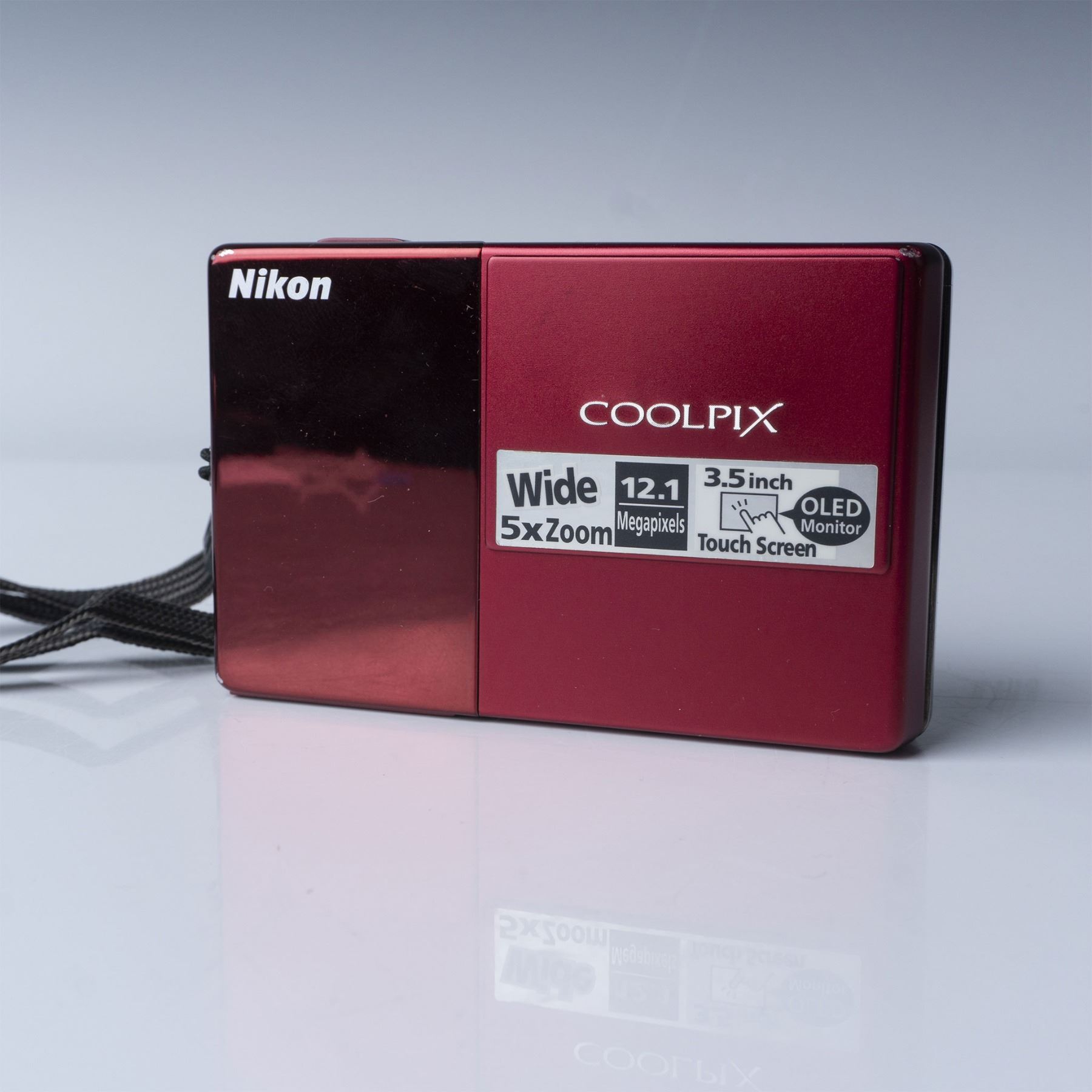 A Nikon Coolpix S70 digital camera, featuring a 12.1-megapixel sensor, wide-angle zoom lens, and a 3.5-inch OLED touchscreen. This compact camera, finished in a sleek red design, includes its original hand strap and a pink protective carrying case. Marked "Made in Japan" on the underside, it is a stylish and portable device for photography enthusiasts.