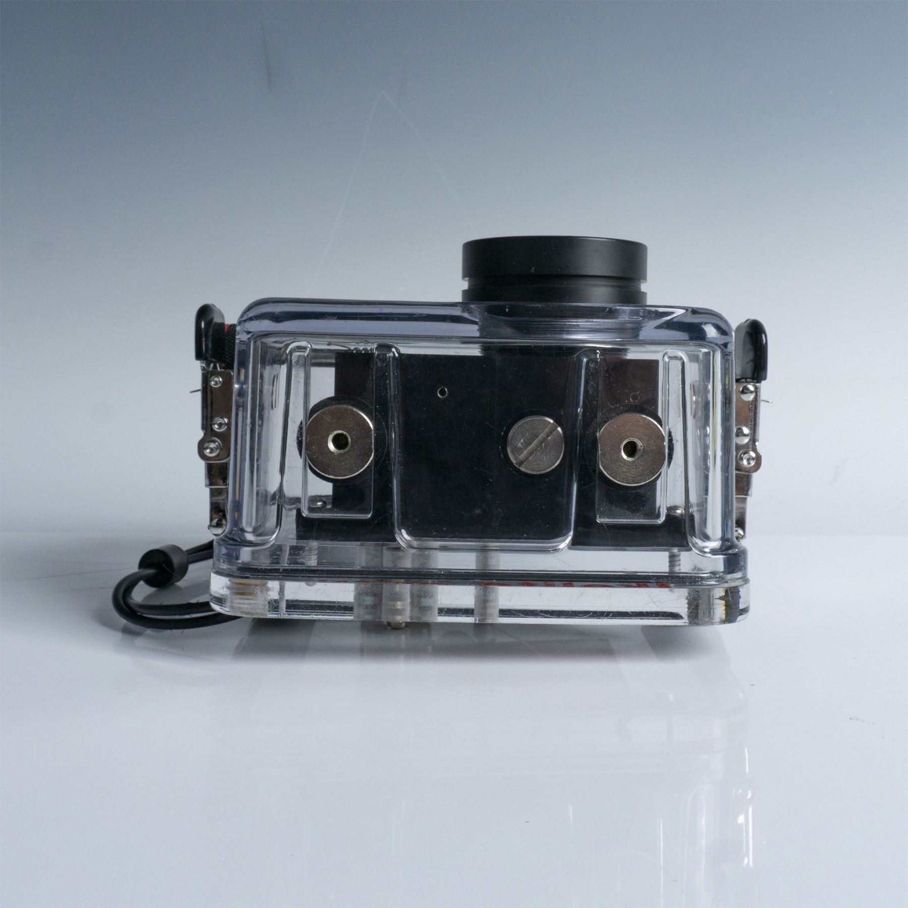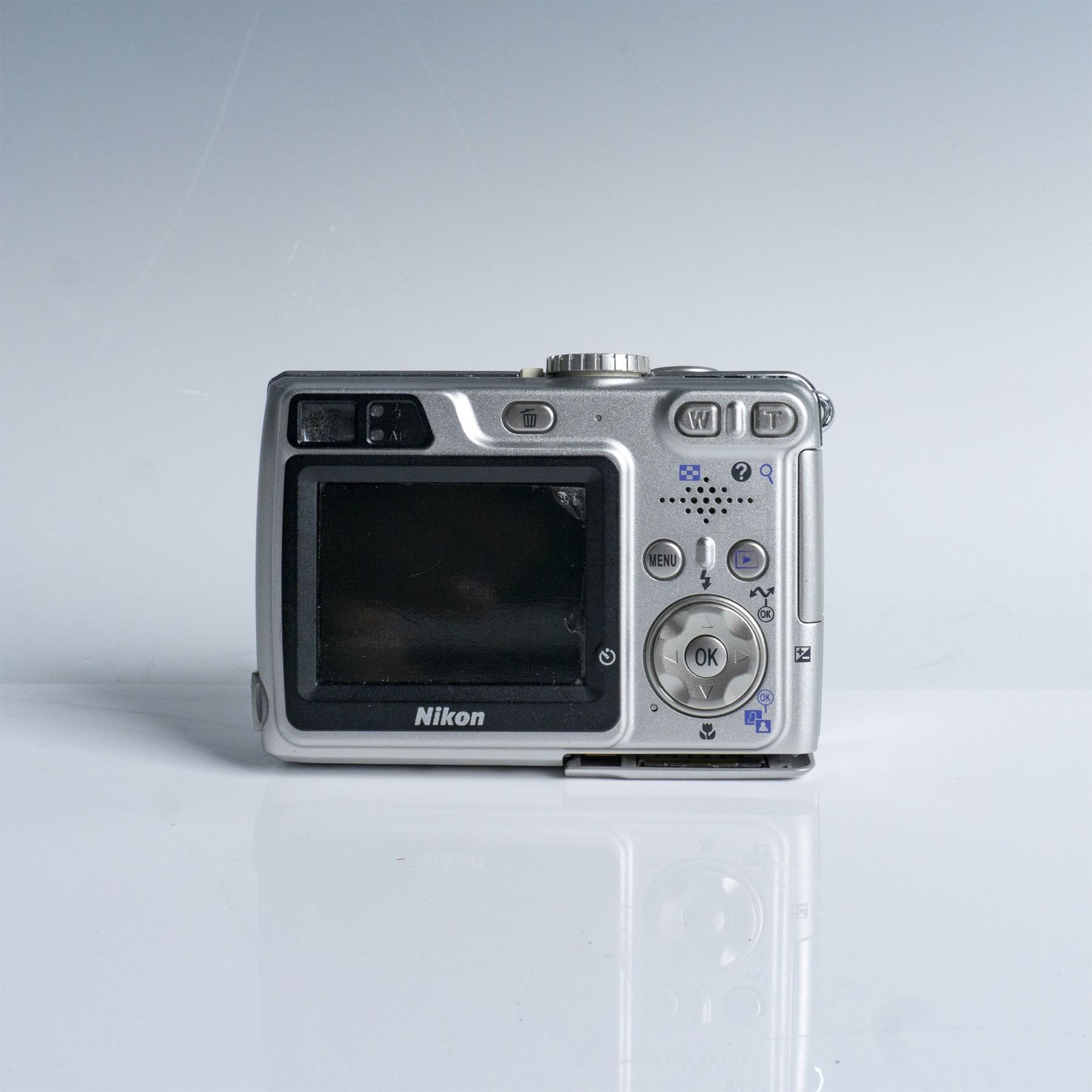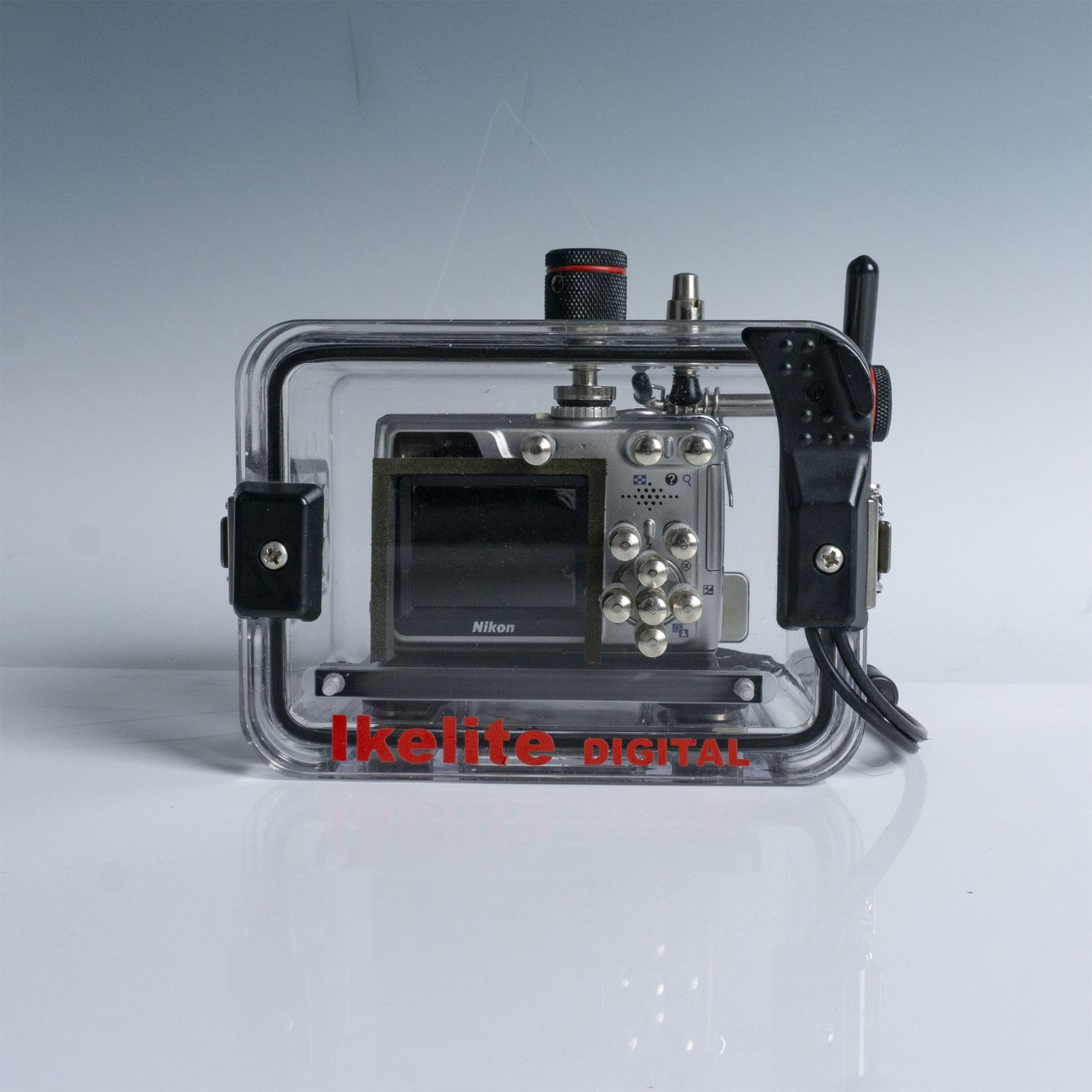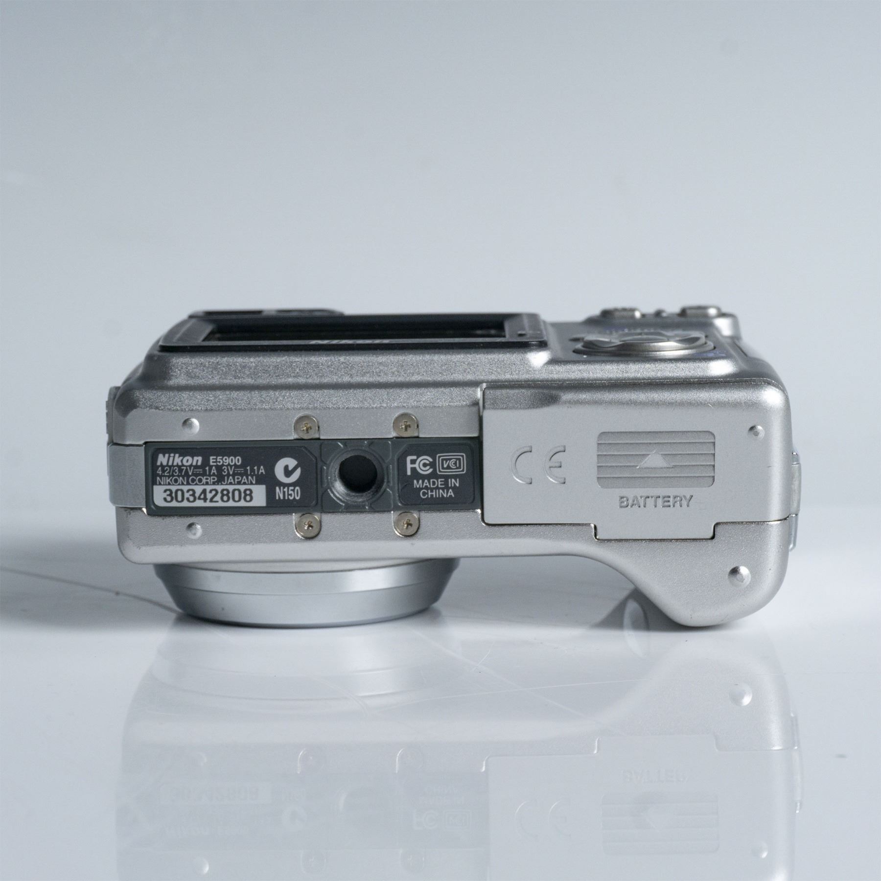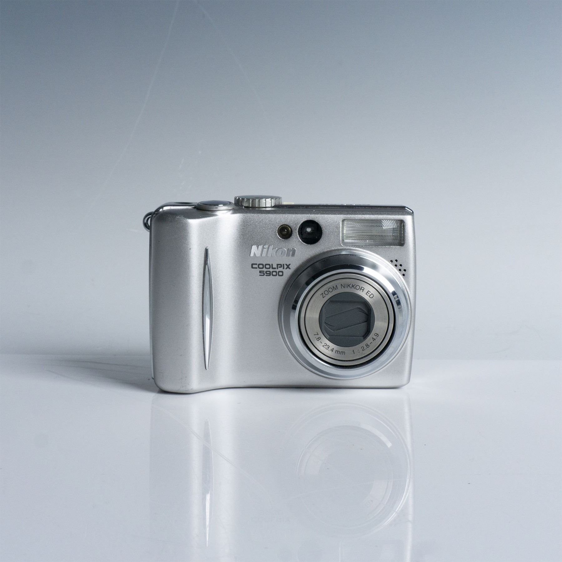 Nikon Coolpix 5900 digital compact camera with matching underwater housing. The camera features a 5.1-megapixel CCD sensor, Zoom-Nikkor ED lens with 3x optical zoom (7.8-23.4mm, f/2.8-4.9), and a 2-inch TFT LCD display. Manufactured in 2005, this model was part of Nikon’s Coolpix line, designed for travel and point-and-shoot versatility. The included underwater housing allows the camera to be used for underwater photography, ideal for diving and snorkeling enthusiasts. Serial number: 30342808. Camera dimensions: 3.5"L x 2.5"W x 1.5"H. Housing dimensions: 6"L x 5"W x 4"H