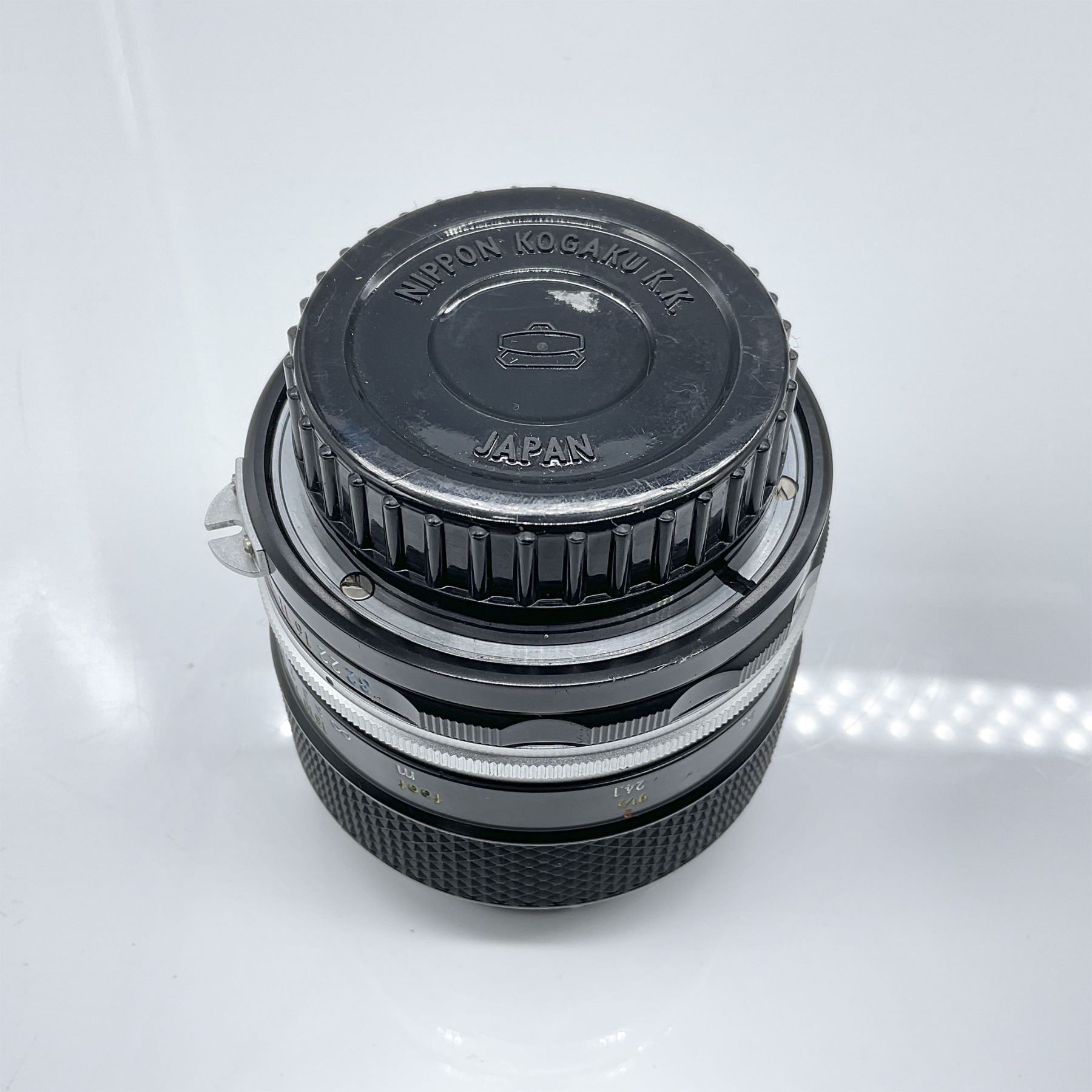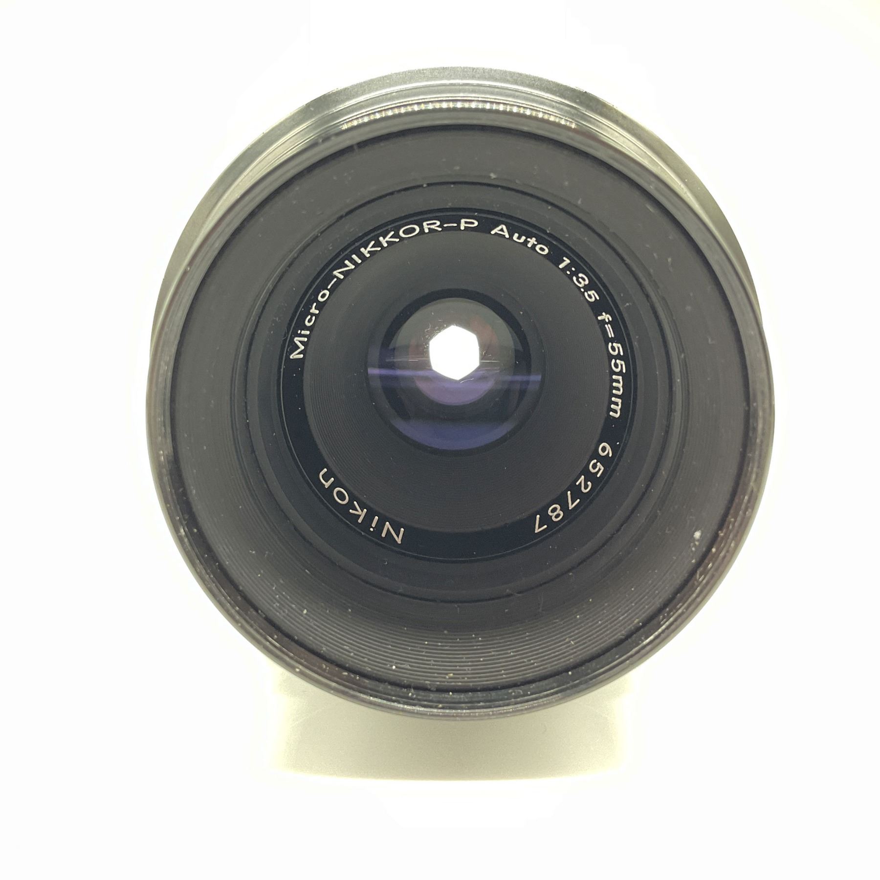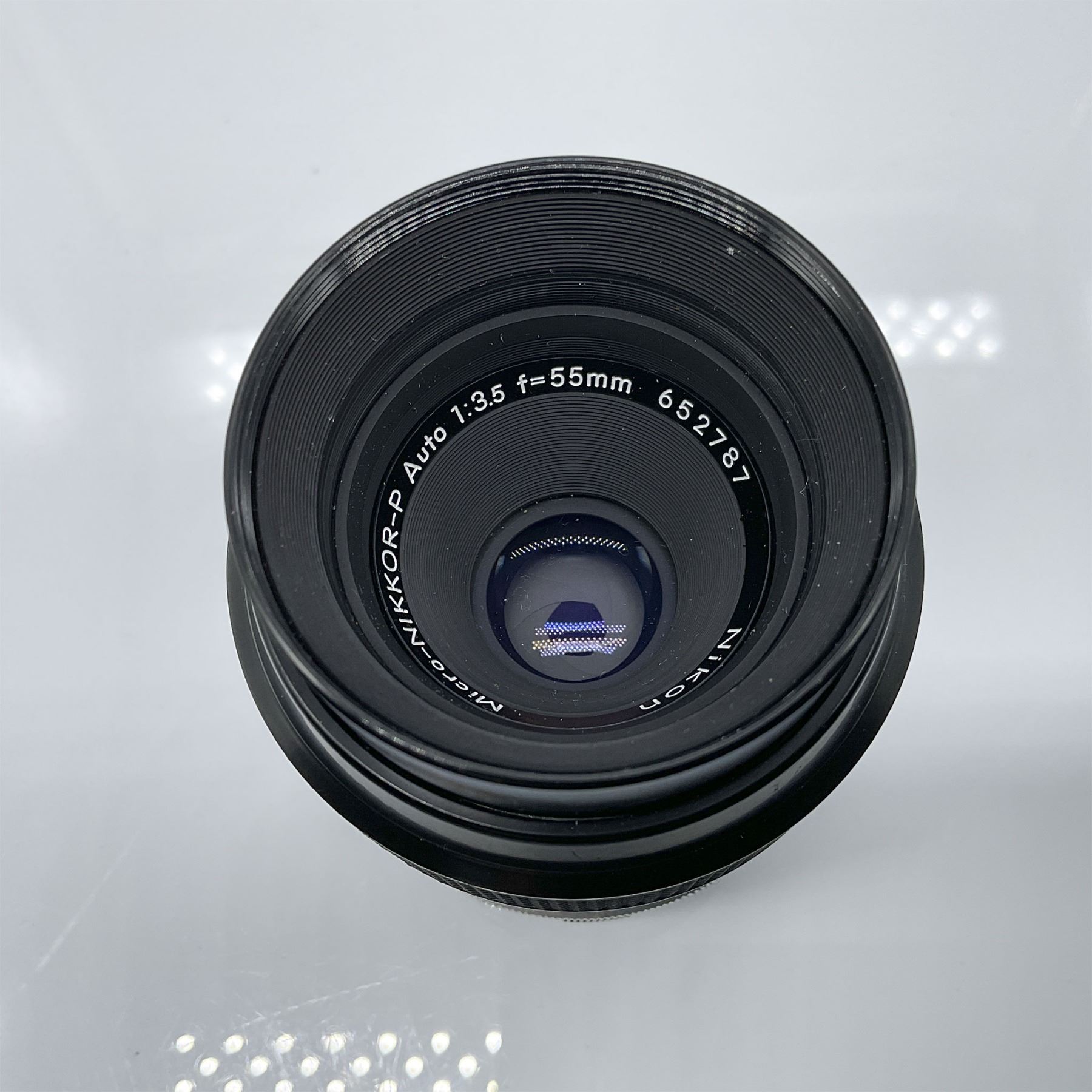 Vintage Nikon Micro-Nikkor Auto 55mm f/3.5 lens, serial number 652787, made in Japan. This precision macro lens offers a close focusing distance, ideal for detailed photography. The lot includes front and rear lens caps, both marked Nippon Kogaku Japan, ensuring complete protection. The lens measures approximately 3.5"H. Renowned for its sharpness and clarity, this lens is a collector's favorite for Nikon enthusiasts and photographers alike.