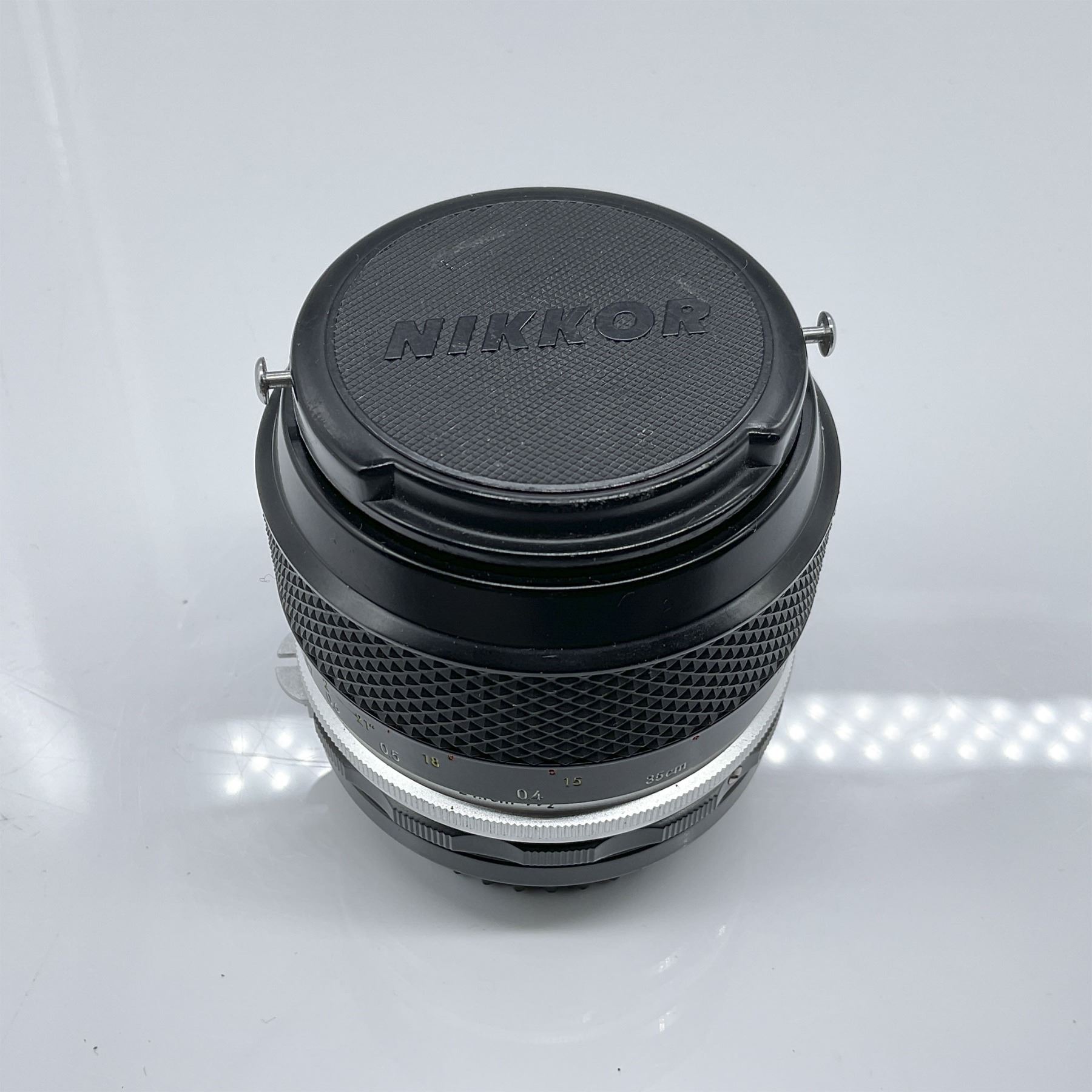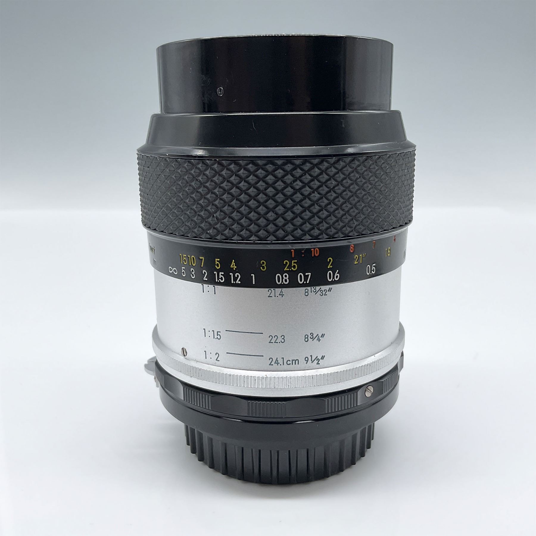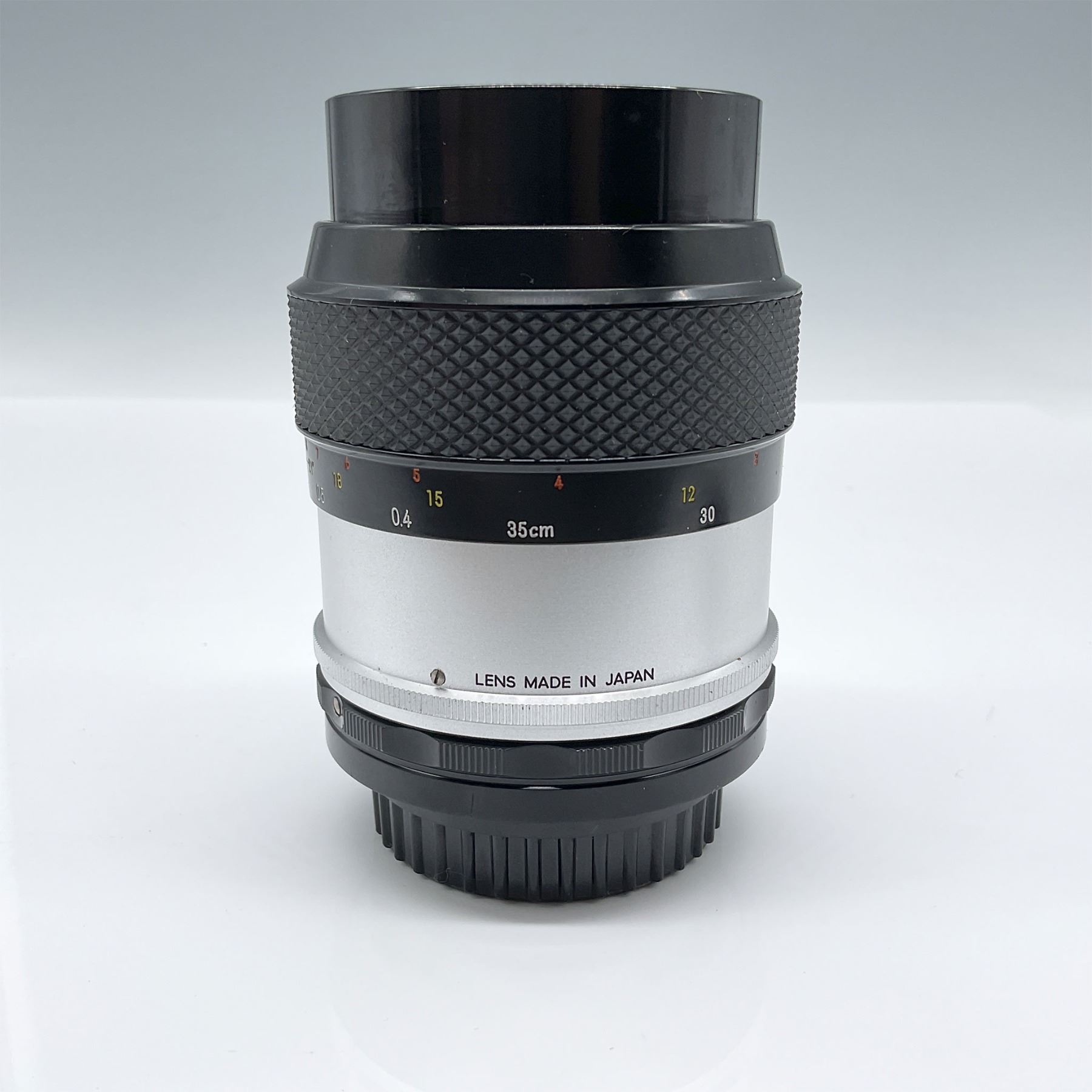 Vintage Nikon Micro-Nikkor Auto 55mm f/3.5 lens, serial number 652787, made in Japan. This precision macro lens offers a close focusing distance, ideal for detailed photography. The lot includes front and rear lens caps, both marked Nippon Kogaku Japan, ensuring complete protection. The lens measures approximately 3.5"H. Renowned for its sharpness and clarity, this lens is a collector's favorite for Nikon enthusiasts and photographers alike.