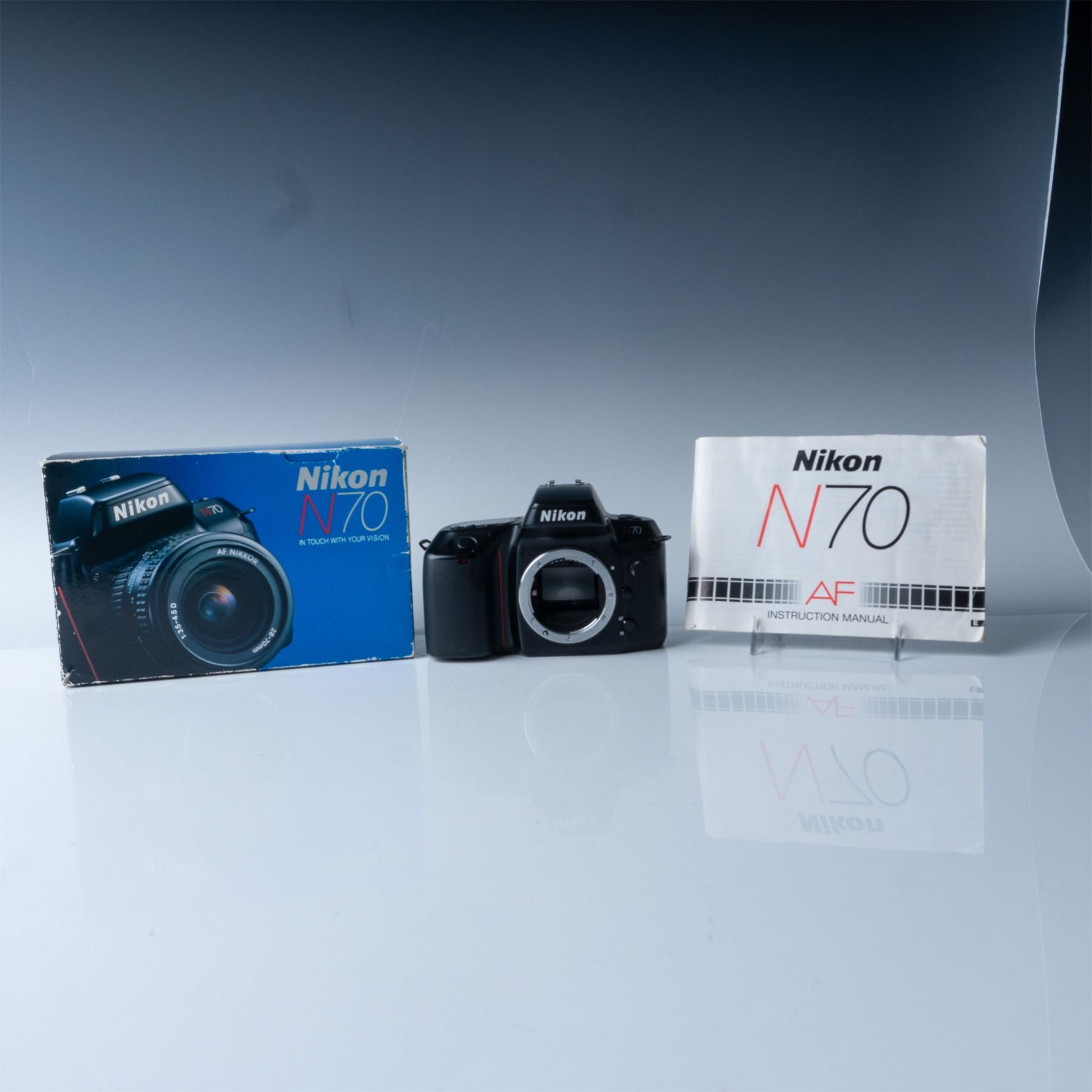 Manufactured in Japan, this Nikon N70 35mm SLR camera body was introduced in 1994, offering advanced features for film photography enthusiasts and professionals. The camera body includes the original box, instruction manual, and system information booklet, ensuring completeness for collectors and users alike. The Nikon N70 features a sleek black design, an intuitive control panel, and compatibility with Nikon’s wide range of lenses. Its autofocus and manual modes make it versatile for various photography styles. The serial number is 2438989.