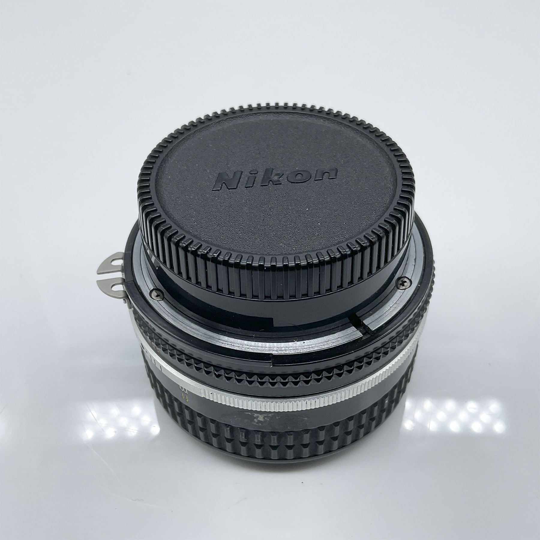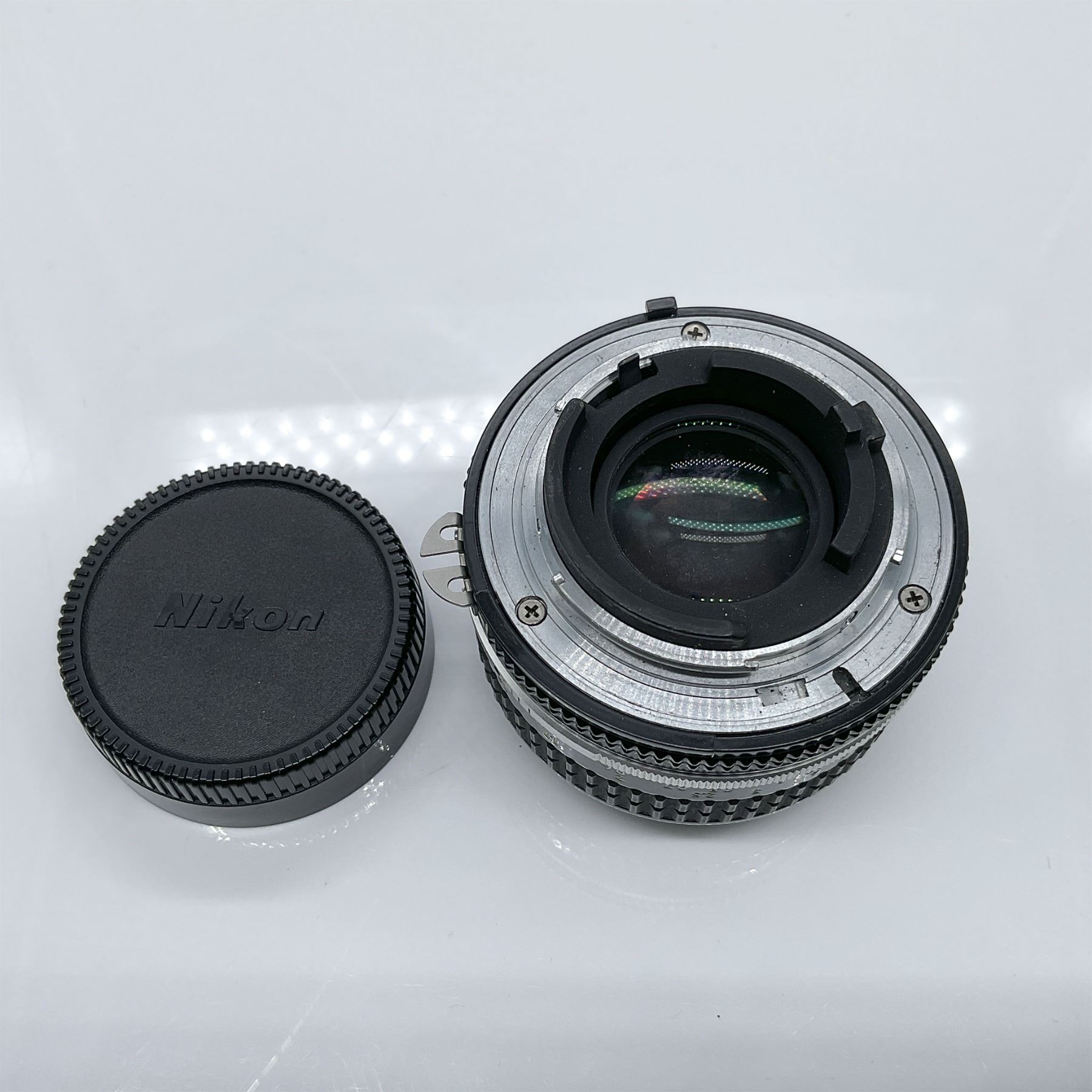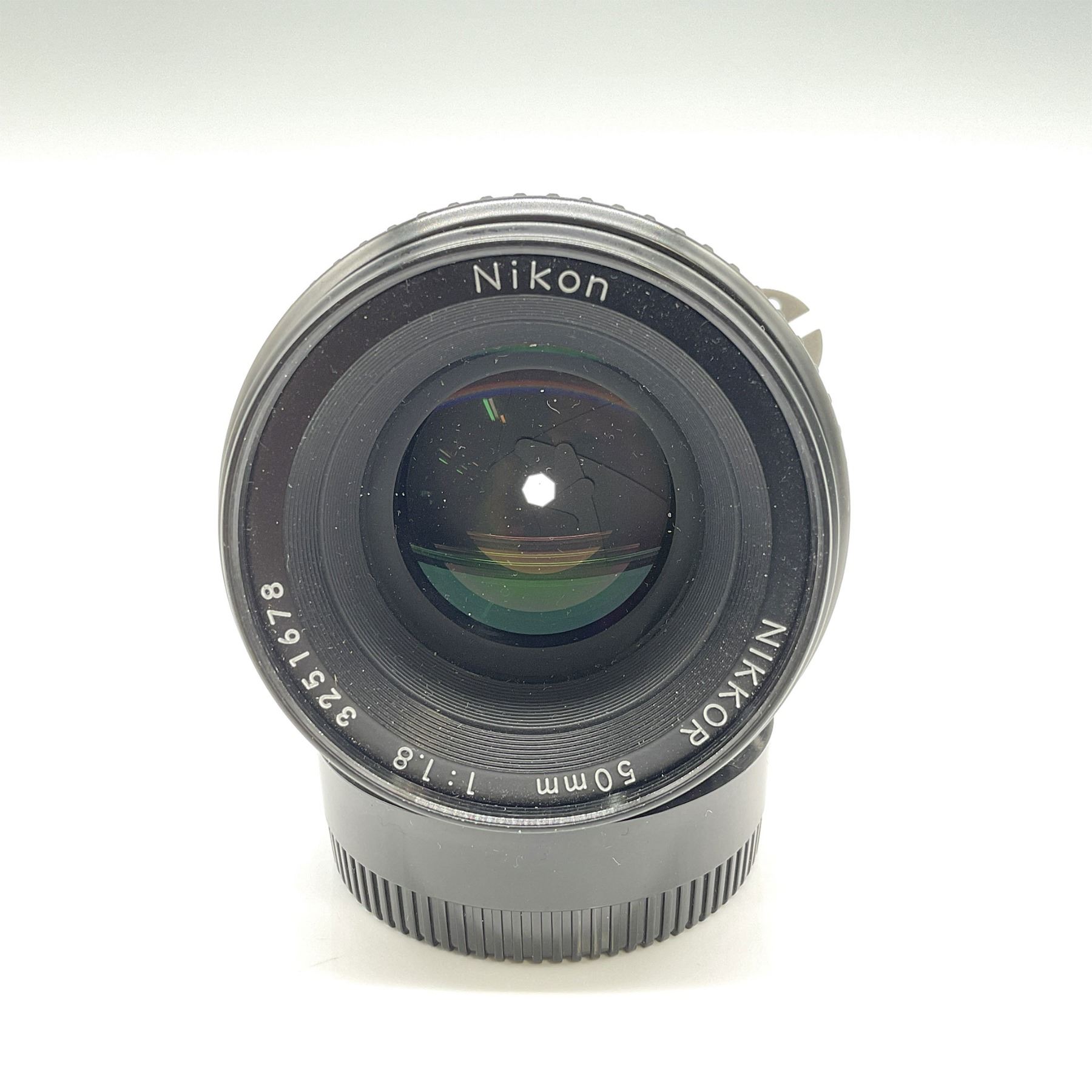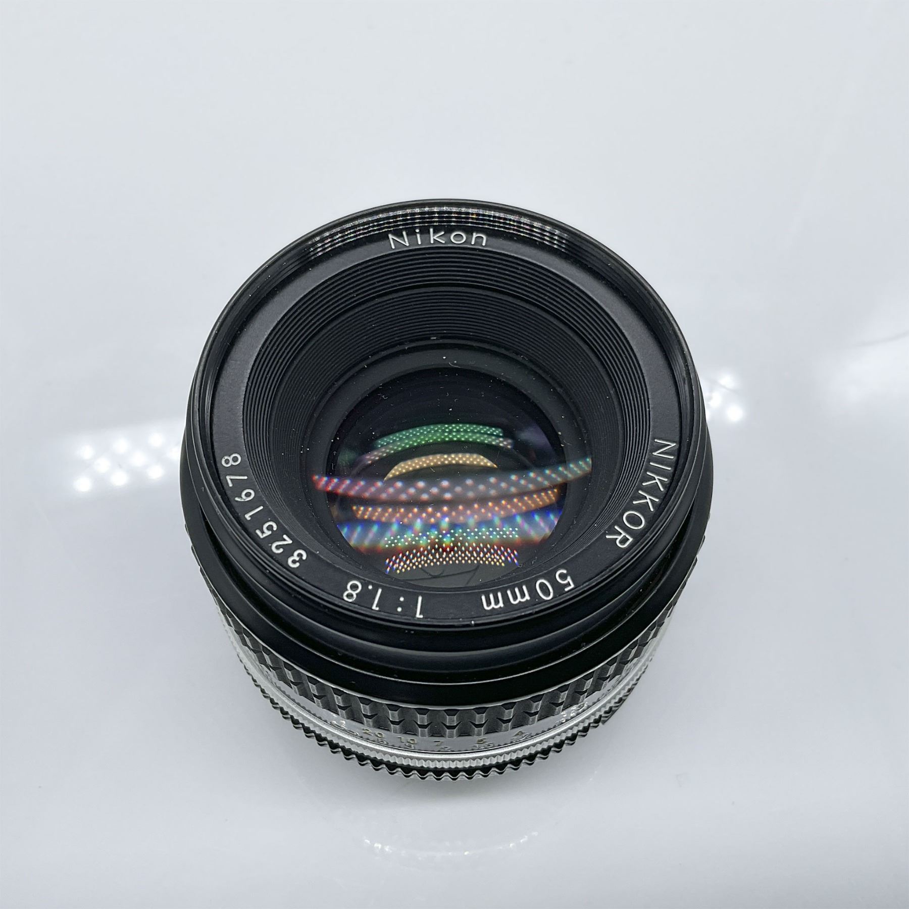 Nikon Nikkor 50mm f/1.8 lens, serial number 3251678, featuring a fast aperture for low-light photography and beautiful bokeh. This vintage manual-focus lens is compatible with Nikon F-mount cameras. Made in Japan, it measures 2.5"H and includes original front and rear caps. Known for its sharp optics and durable construction, this lens is highly sought after by collectors and photography enthusiasts. Minimal external wear, optics appear clean with no visible scratches. A versatile piece for vintage Nikon system users.