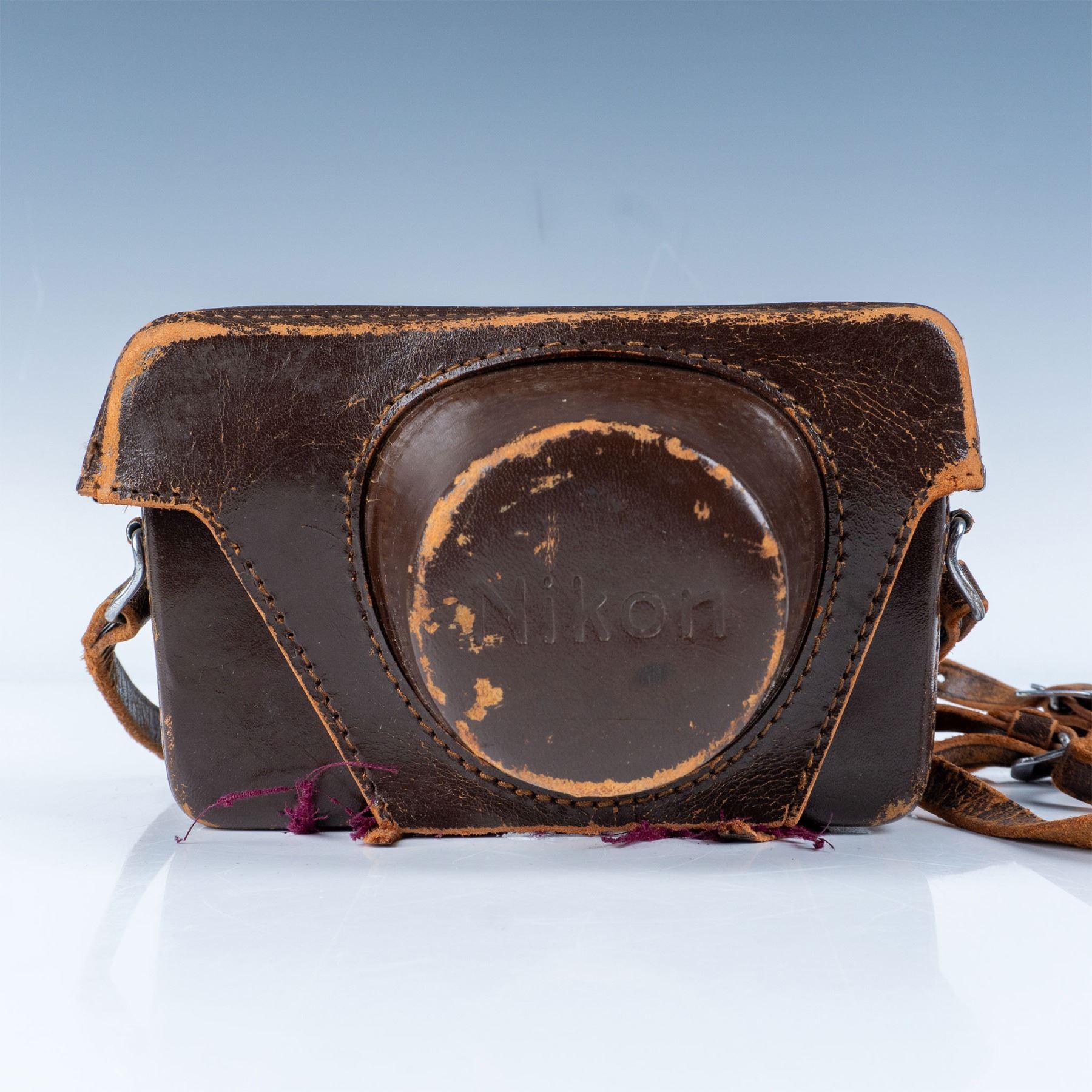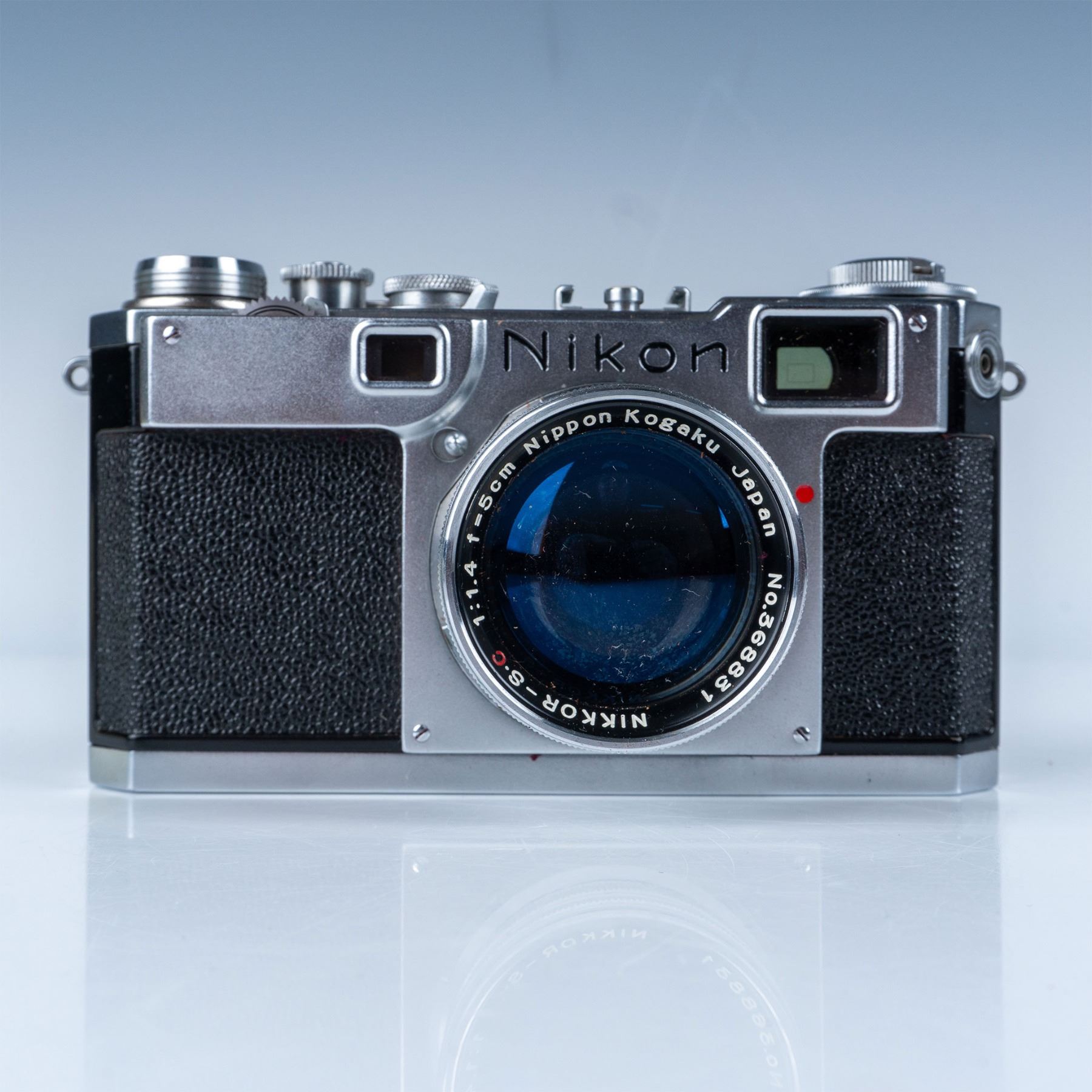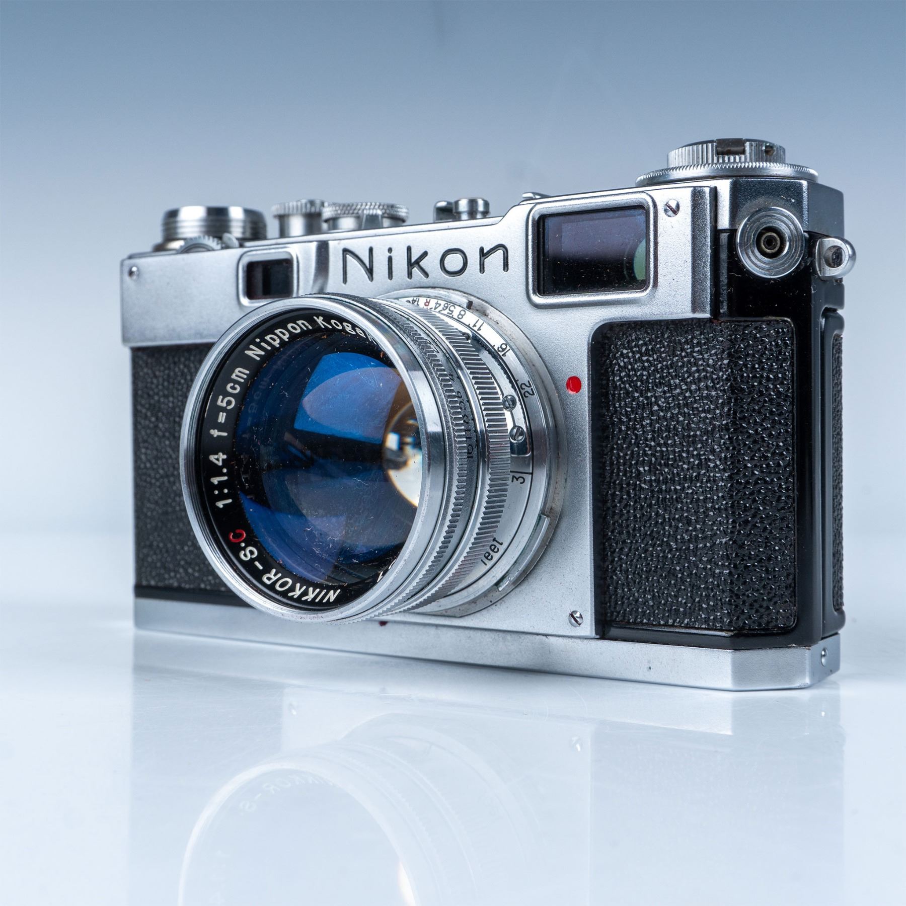 This auction features a Nikon S2 rangefinder camera, a highly collectible model from the mid-1950s. The camera body showcases classic chrome-finish details, reflecting Nikon's exceptional build quality. Equipped with the renowned Nikkor-SC 50mm f/1.4 lens, this camera offers sharp optics and excellent low-light performance, making it a favorite among photographers and collectors alike. The lens features a fast aperture and the "Nippon Kogaku" branding, further adding to its vintage charm and authenticity. Included with this lot is a worn leather case with a matching strap, a functional accessory that enhances the camera's vintage appeal.