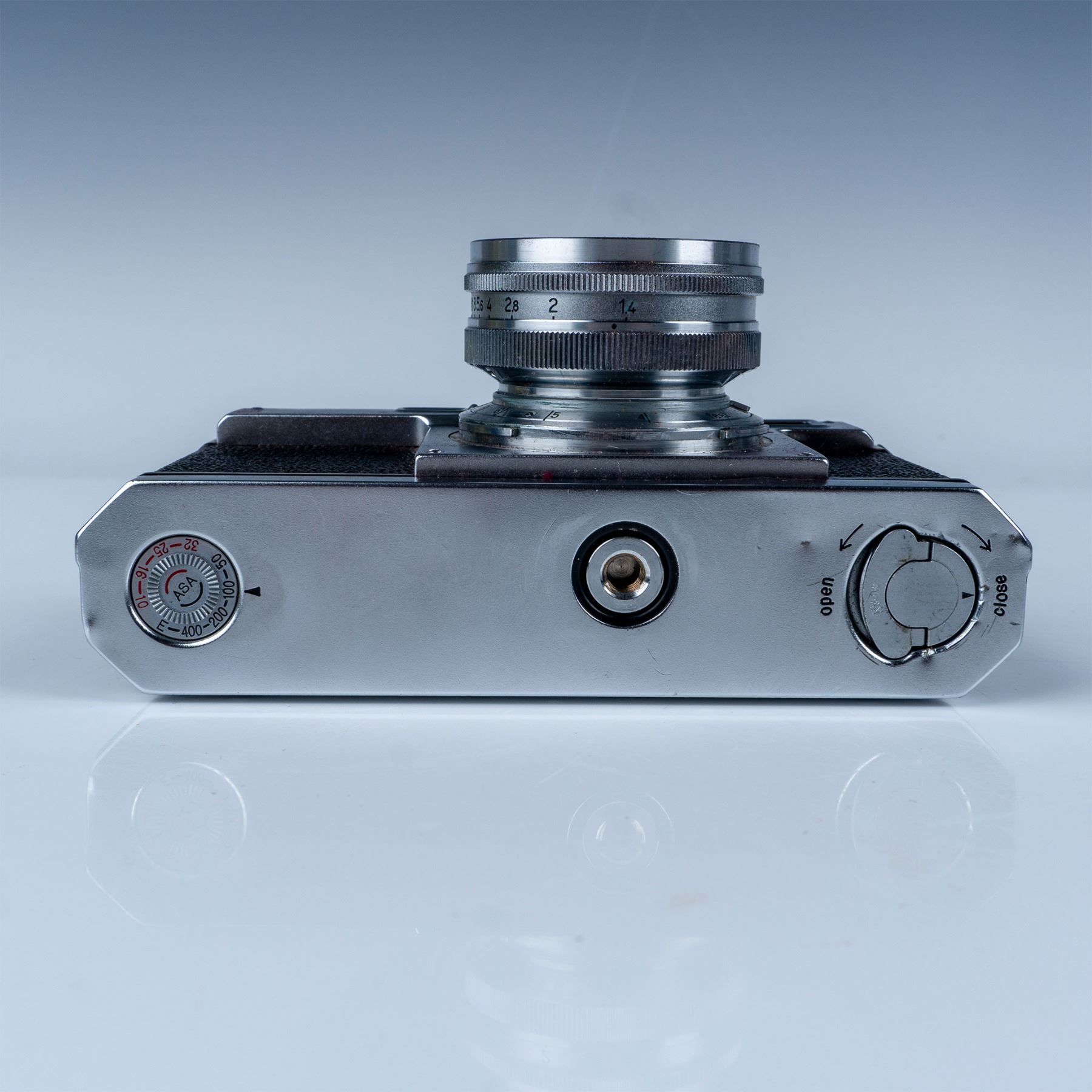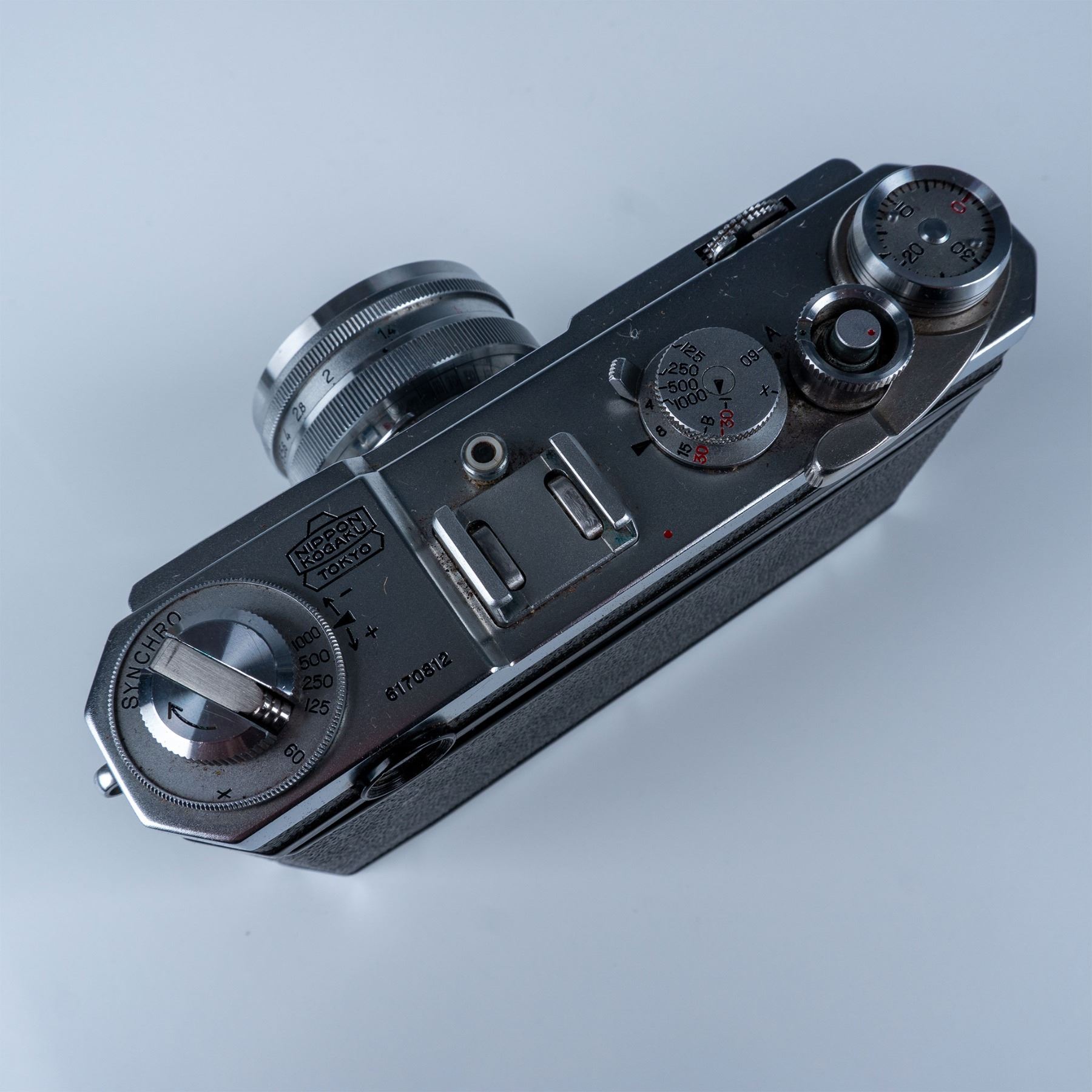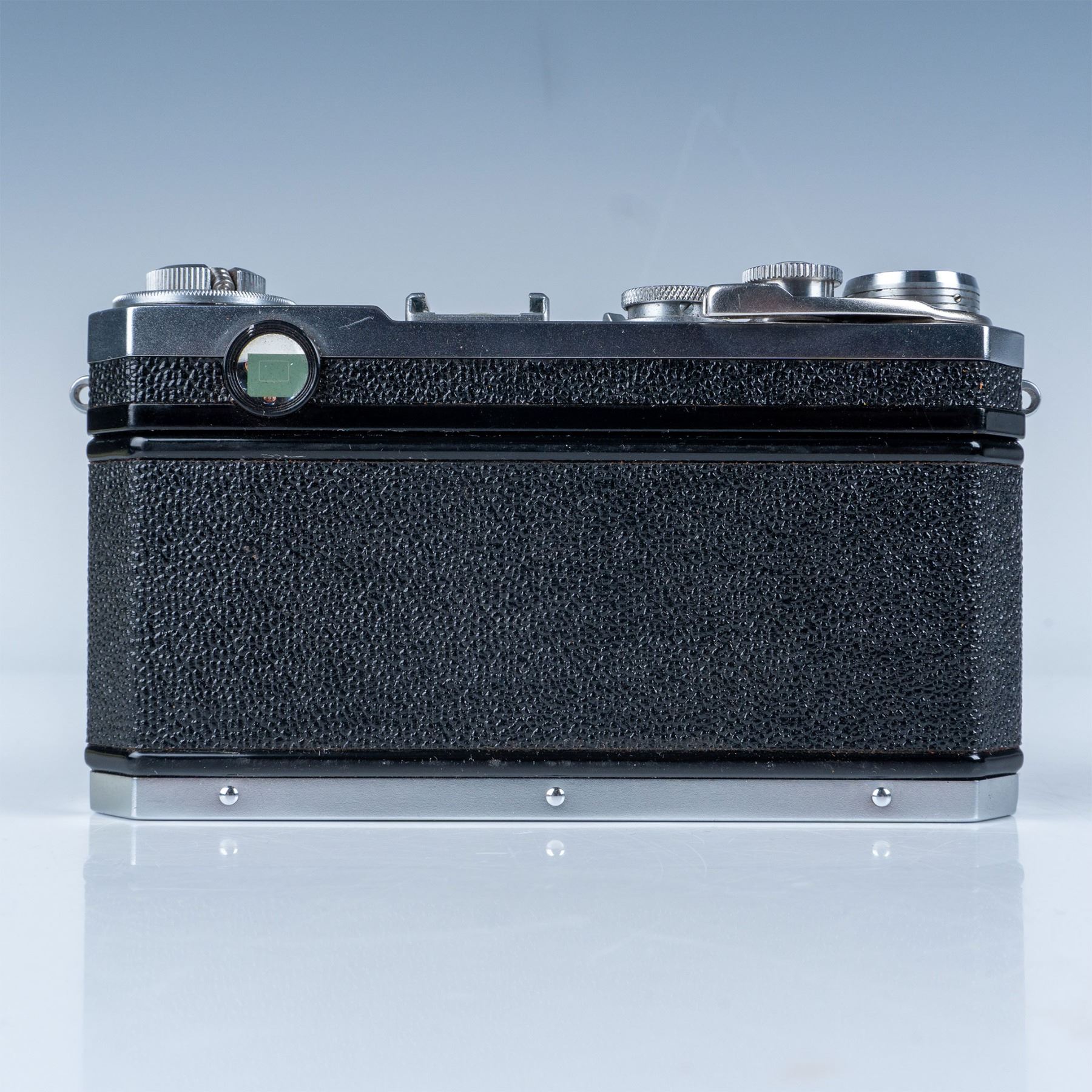 This auction features a Nikon S2 rangefinder camera, a highly collectible model from the mid-1950s. The camera body showcases classic chrome-finish details, reflecting Nikon's exceptional build quality. Equipped with the renowned Nikkor-SC 50mm f/1.4 lens, this camera offers sharp optics and excellent low-light performance, making it a favorite among photographers and collectors alike. The lens features a fast aperture and the "Nippon Kogaku" branding, further adding to its vintage charm and authenticity. Included with this lot is a worn leather case with a matching strap, a functional accessory that enhances the camera's vintage appeal.