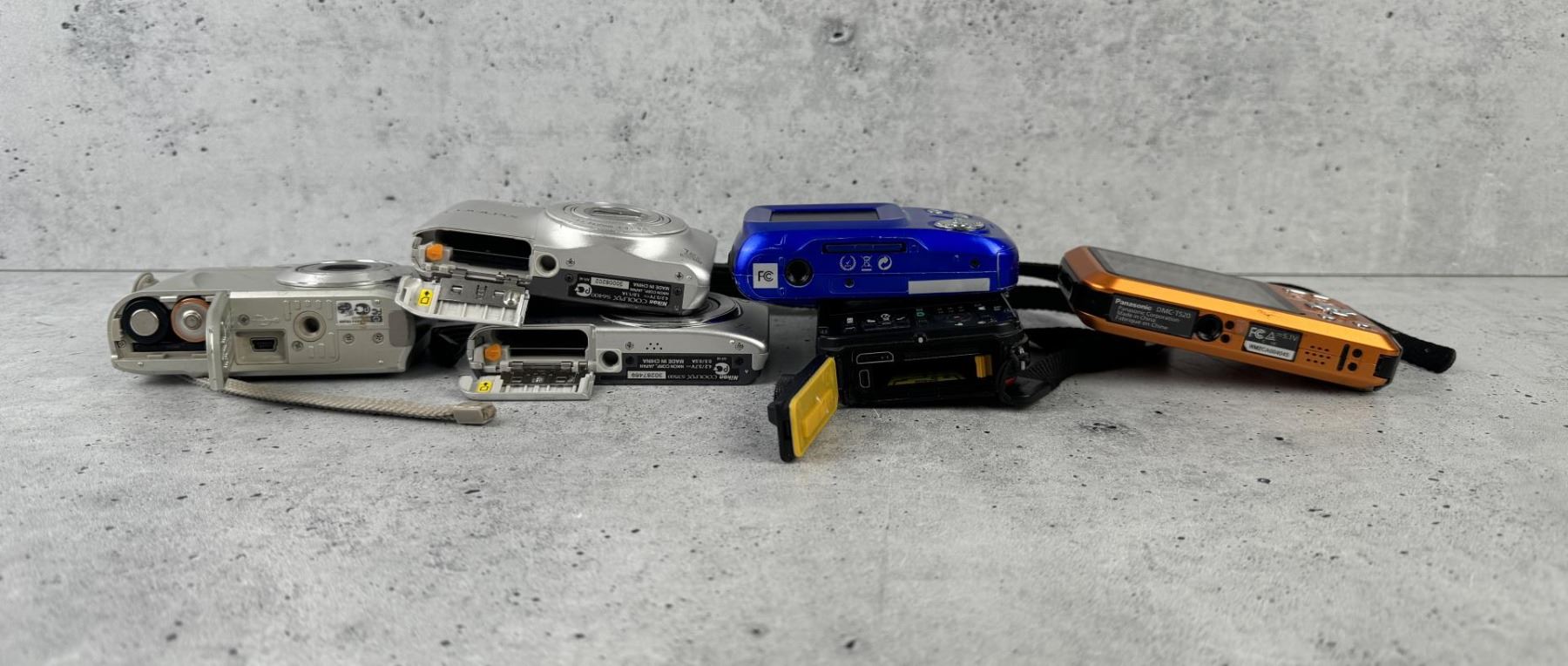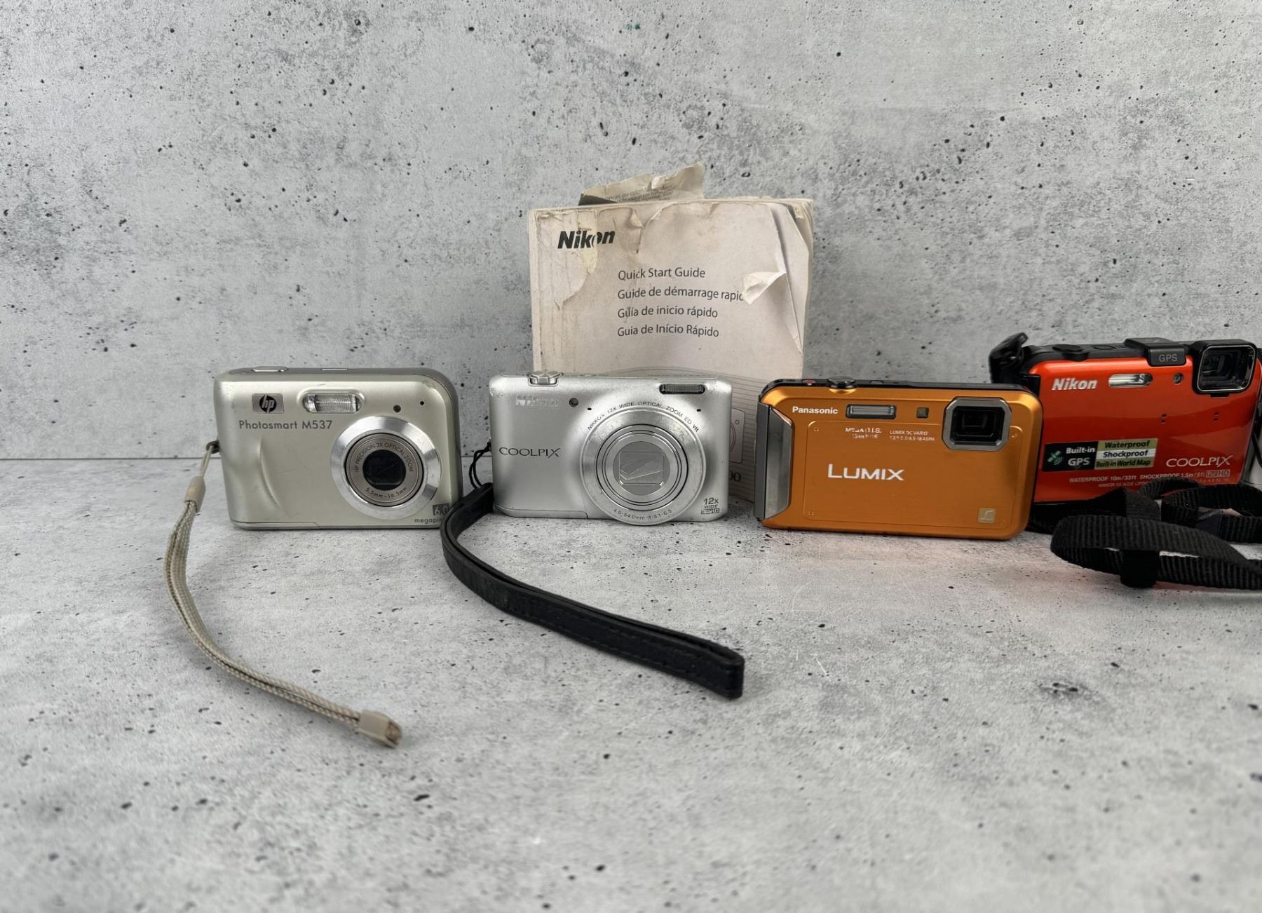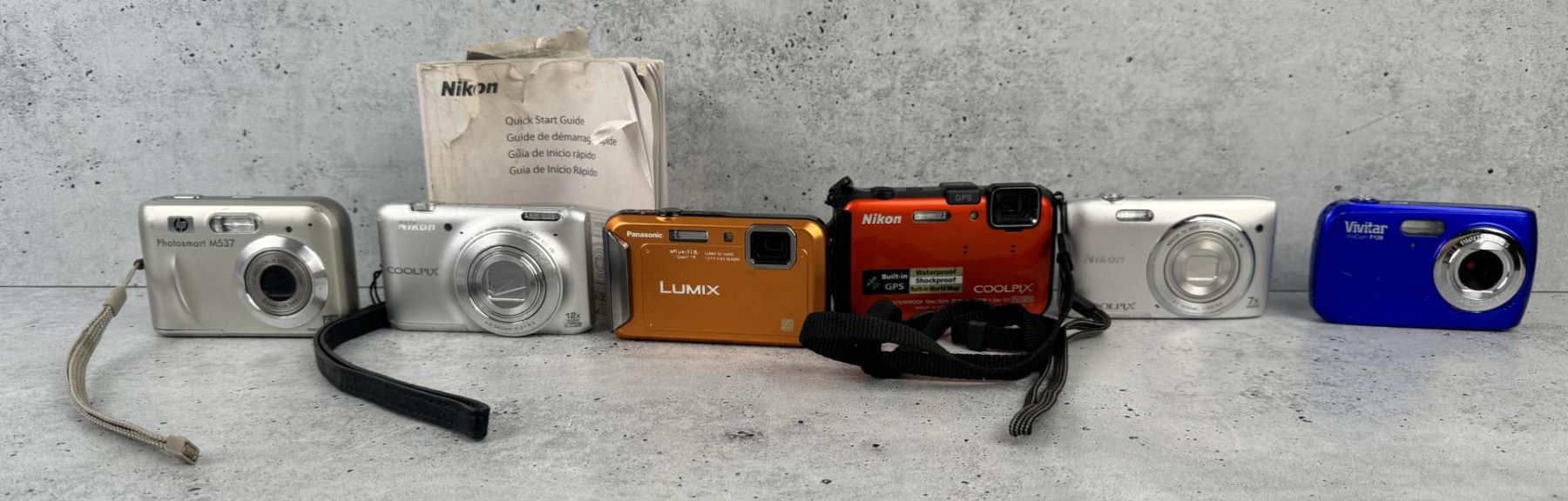 Nice grouping. Vivitar and Lumix not working, HP has a damaged screen, the three Nikon are missing batteries.