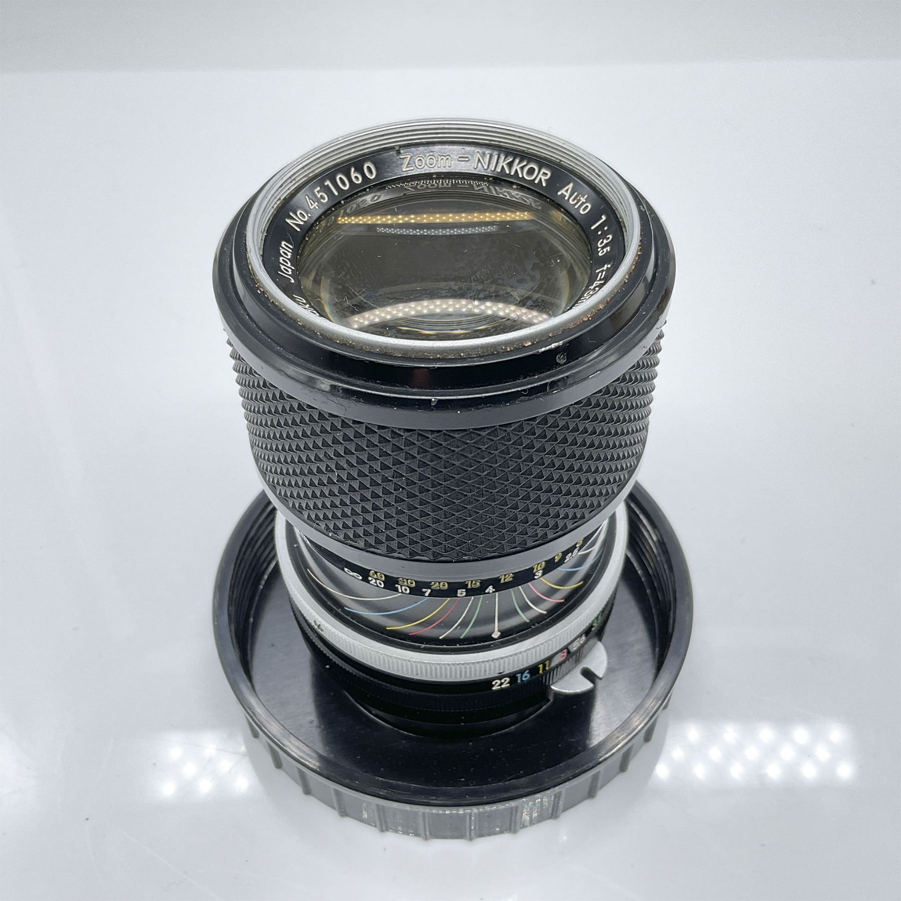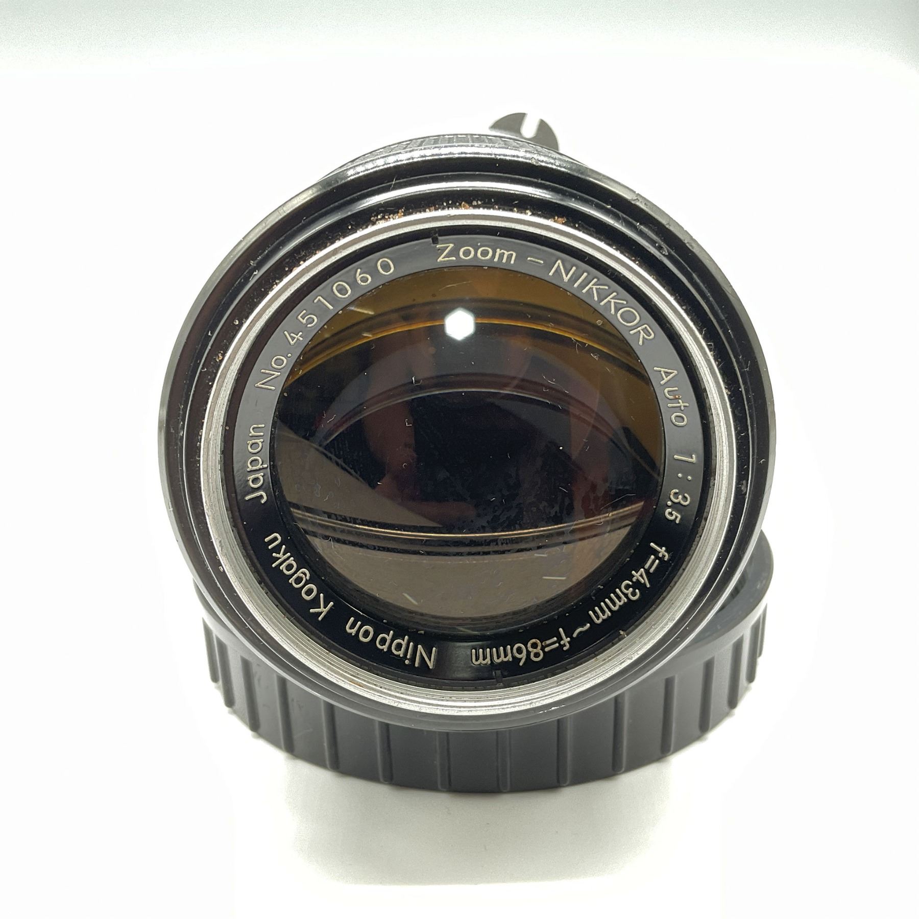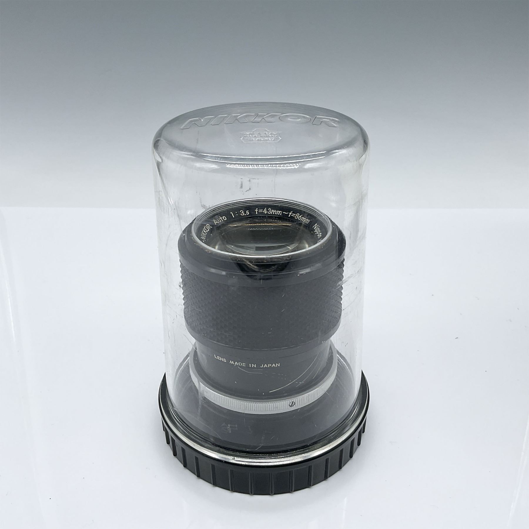 Nikon Zoom-NIKKOR Auto Lens, 43-86mm, F:3.5, serial number 451060, manufactured by Nippon Kogaku Japan. This vintage lens features a metal construction and manual aperture control ranging from f/3.5 to f/22. The lot includes the original box, measuring 5.75"H, and the clear plastic display/storage case with a black screw-on base. The lens measures 3.75"H when fully extended. This classic Nikon lens is ideal for collectors or photography enthusiasts seeking vintage optics.