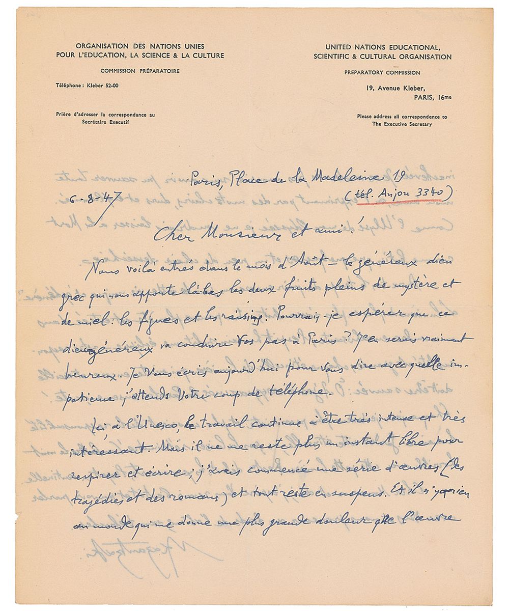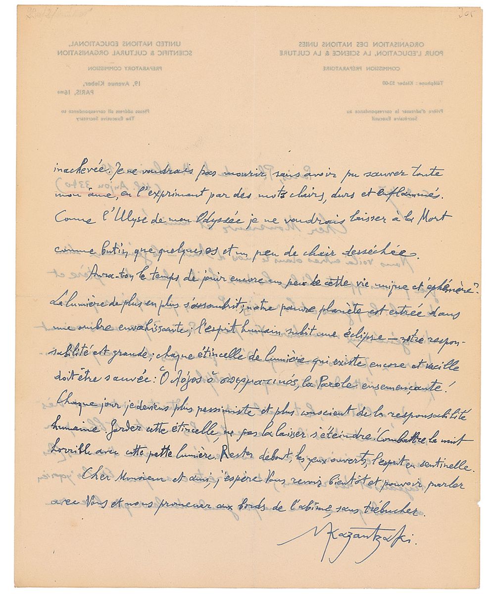 Greek writer and philosopher (1883–1957) best known for his novel Zorba the Greek. Extremely rare ALS in French, one page both sides, 8 x 10, Organisation des Nations Unies Pour L’Education, La Science & La Culture letterhead, June 8, 1947. Letter to Swedish Hellenist historian Borje Knos. In part (translated): "Here we are in the month of August—the generous Greek god who brings us there these both fruits full of mystery and honey, figs and grapes. Could I hope that this generous god will lead your steps to Paris? I would really be happy…Here, in Unesco's office, the work has been very intense and interesting. But it does not leave me with much free time to breathe and write, I began a series of works (tragedies and novels) and everything remains unresolved. And there is nothing in the world that gives me a greater pain than unfinished work. I do not want to die without being able to save my full soul, by expressing it in clear, hard and inflamed words. Like Ulysses in my Odyssey, I would only let death get a few bones and a bit of dried flesh…Shall we still have time to enjoy this unique and ephemeral life? Light increasingly darkens our poor planet, as we are entering a pervasive shadow, the human mind suffers an eclipse—our responsibility is great, and every spark of light that exists must be saved…the word beginning! Every day, I become more and more pessimistic and more aware of human responsibility. Keep that spark, do not let it off! To fighting this horrible night with this little light. To standing with open eyes, mind being like a sentinel." In fine condition. Accompanied by a TLS from Kazantzakis’s widow forwarding this letter to a charity auction for the Association Suisse en Faveur des Enfants Infirmes Moteurs Cerebraux.
