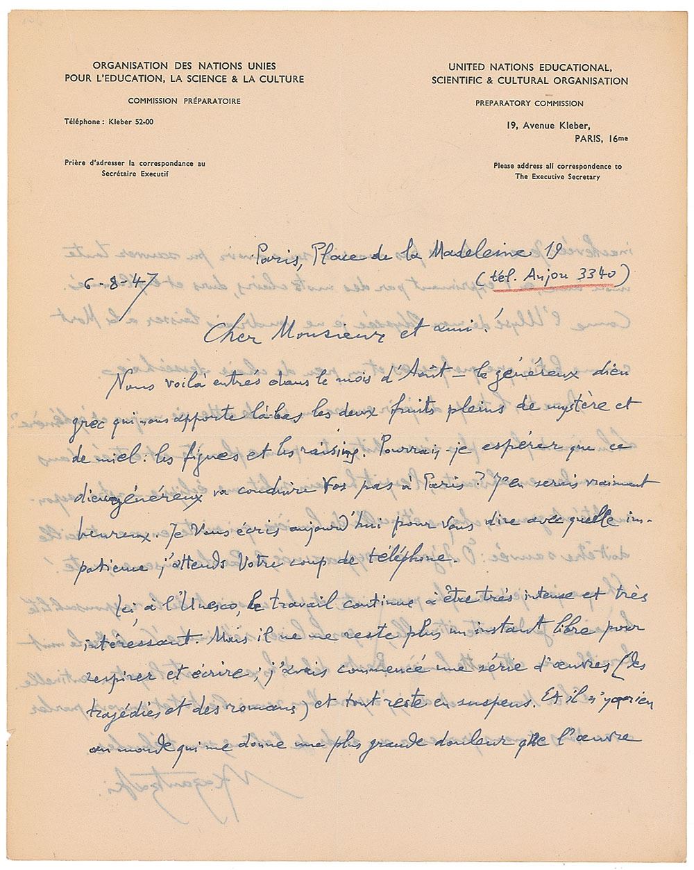 Greek writer and philosopher (1883–1957) best known for his novel Zorba the Greek. Extremely rare ALS in French, one page both sides, 8 x 10, Organisation des Nations Unies Pour L'Education, La Science & La Culture letterhead, June 8, 1947. Letter to Swedish Hellenist historian Borje Knos. In part (translated): "Here we are in the month of August-the generous Greek god who brings us there these both fruits full of mystery and honey, figs and grapes. Could I hope that this generous god will lead your steps to Paris? I would really be happy…Here, in Unesco's office, the work has been very intense and interesting. But it does not leave me with much free time to breathe and write, I began a series of works (tragedies and novels) and everything remains unresolved. And there is nothing in the world that gives me a greater pain than unfinished work. I do not want to die without being able to save my full soul, by expressing it in clear, hard and inflamed words. Like Ulysses in my Odyssey, I would only let death get a few bones and a bit of dried flesh…Shall we still have time to enjoy this unique and ephemeral life? Light increasingly darkens our poor planet, as we are entering a pervasive shadow, the human mind suffers an eclipse-our responsibility is great, and every spark of light that exists must be saved…the word beginning! Every day, I become more and more pessimistic and more aware of human responsibility. Keep that spark, do not let it off! To fighting this horrible night with this little light. To standing with open eyes, mind being like a sentinel." In fine condition. Accompanied by a TLS from Kazantzakis's widow forwarding this letter to a charity auction for the Association Suisse en Faveur des Enfants Infirmes Moteurs Cerebraux.