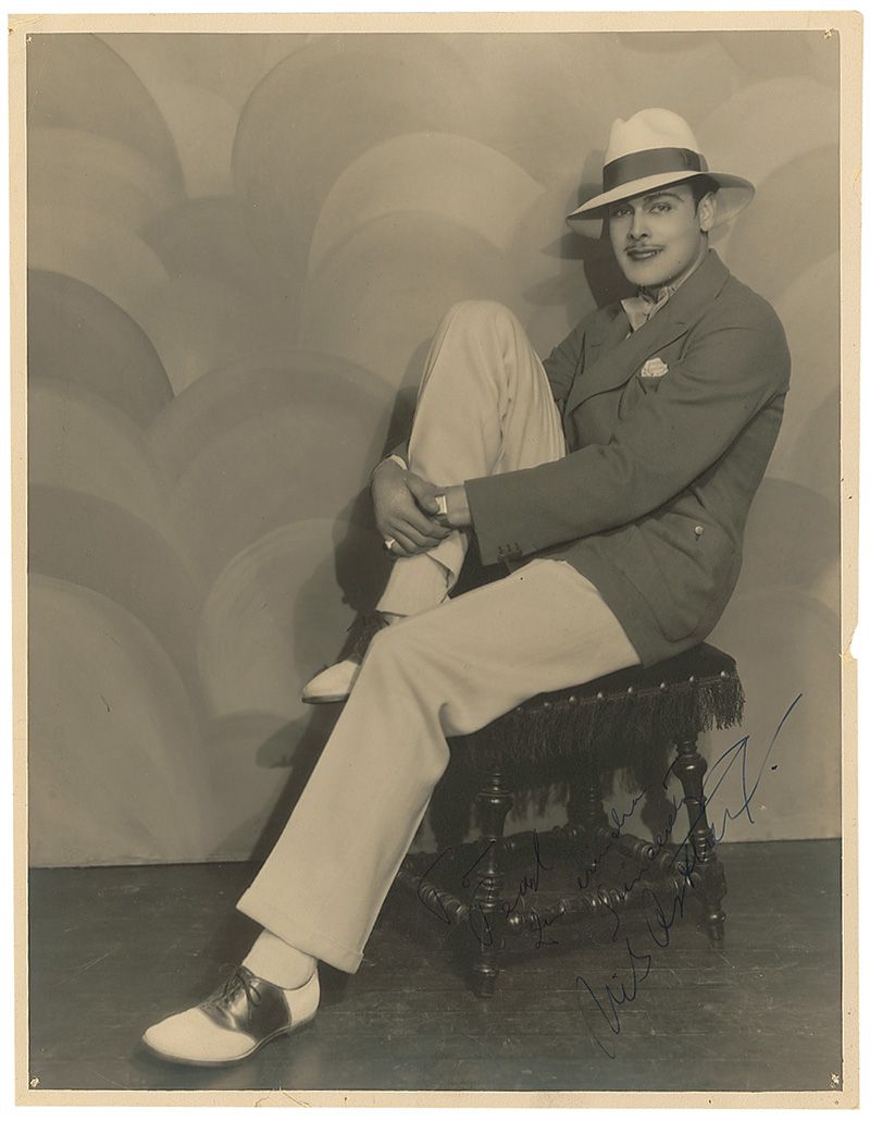 Handsome vintage matte-finish 10.5 x 13.75 photo of Asther dressed to the nines, signed and inscribed in fountain pen. In very good condition, with creases to the corners and borders, tack holes to each corner, a chip to the right border, a couple small tears and tack hole to the lower border, slight silvering to dark areas of the image, and moderate contrast to the inscription and signature.