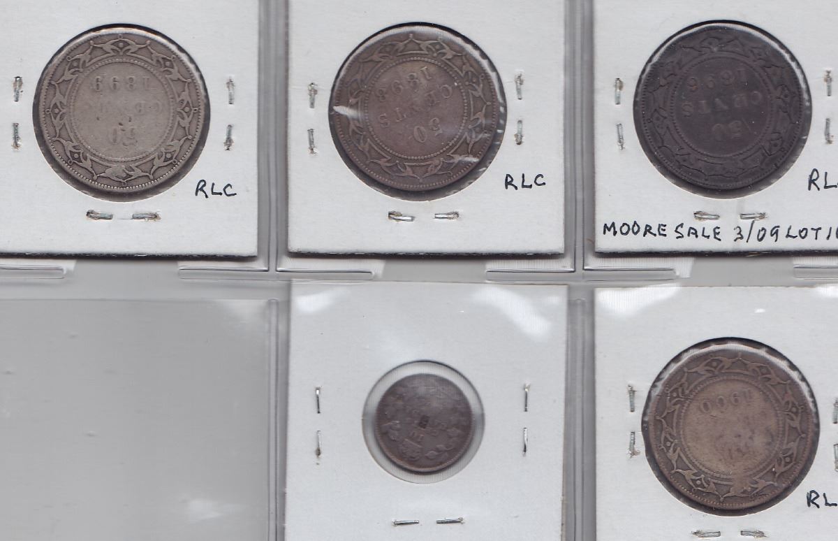 1. NO within rectangular cartouche on obv. of Newfoundland 50¢, 1896 (Brunk O-13); 2. Obv. of Newfoundland 50¢, 1898 (M.I. 699, Brunk O-13); 3. Obv. of Newfoundland 50¢, 1899 (Brunk O-13); 4. Obv. of Newfoundland 50¢, 1900 (M.I. 700, Brunk O-13); 5. Obv. & rev. of Canada Victoria 10¢, 1906 (Brunk O-13). 5 Pcs.