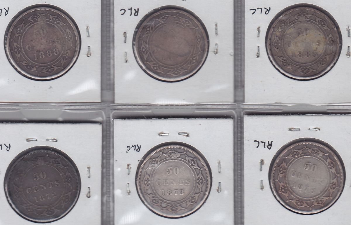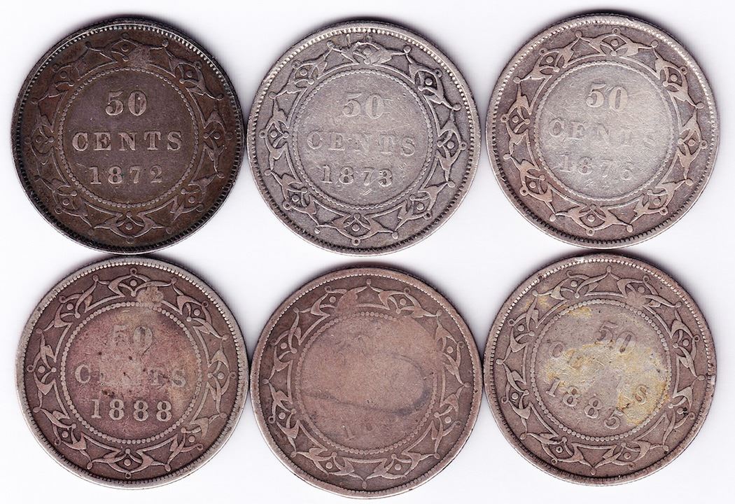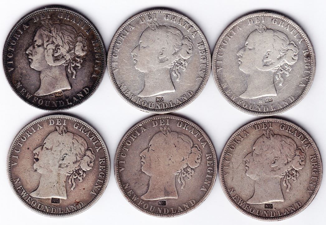 1. NO within rectangular cartouche on obv. of Newfoundland 50¢, 1872 (Brunk O-13); 2. Obv. of Newfoundland 50¢, 1873 (M.I. 697, Brunk O-13)l 3. Obv. of Newfoundland 50¢, 1876-H (M.I. 698, Brunk O-13); 4. Obv. of Newfoundland 50¢, 1881 (Brunk O-13); 5. Obv. of Newfoundland 50¢, 1885 (Brunk O-13) 6. Obv. of Newfoundland 50¢, 1888 (Brunk O-13). 6 Pcs.