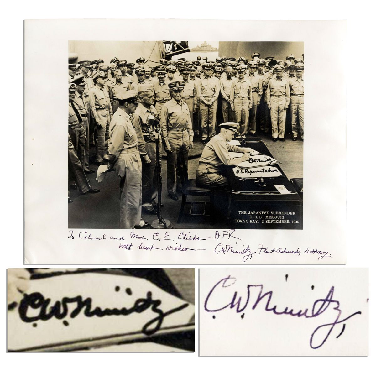 WWII U.S. Navy Fleet Admiral Chester Nimitz signs and inscribes on the lower border of the official 13.75'' x 10.5'' matte photo: ''To Colonel and Mrs C.E. Childs - AFR / With best wishes / C.W. Nimitz, Fleet Admiral, US Navy.'' Standing behind Nimitz as he signs the Japanese surrender documents aboard the U.S.S. Missouri are (left to right) General of the Army Douglas MacArthur, Admiral William F. Halsey, USN, and Rear Admiral Forrest Sherman, USN. Minor creasing, else near fine.