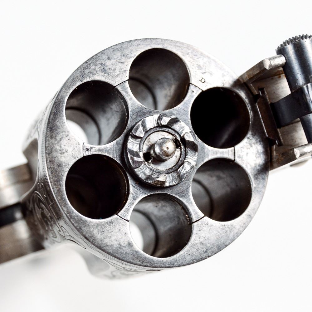"Nimschke" Engraved Smith & Wesson Russian No.3 top break revolver in .44 S&W Russian. The renowned engraver, Louis Daniel Nimschke (July 4, 1832 – April 29, 1904) was a master firearms engraver of the 19th century who engraved over 5,000 firearms between 1850 and 1904 for Smith & Wesson and other manufacturers. Born in Germany in 1832, Nimschke moved to the United States in 1850 at the age of 18 and began engraving jewelry, silverware, watch cases and dog collars. Nimschke was trained in both the European style of engraving which was represented by fine delicate lines and the bolder American style characterized by his scrollwork. This is an exquisite and extremely RARE example of his art with the nickel finish in extremely fine vintage condition showing only minor freckling, wear, darkening and hair scratches. Slight pitting on the right side of the frame behind the hammer. The real ivory scales with defining grain are in excellent condition with very minor nicks (hardly noticeable). A true museum piece for YOUR collection. MFG 1871-74 C&R Eligible S/N 38804