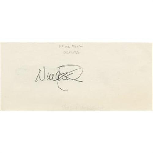 <B>Nina Foch Autograph.</B></I> A 3.5" x 8" card autographed by Nina Foch. The star of <I>My Name Is Julia Ross</B></I> signed the card in black ink; her signature is large and clean. In Excellent condition though there is additional print along top border in pencil (in an unknown hand).<BR><BR><b>Shipping:</b> Flat Material, Small (<a target="_blank" href="http://www.heritageauctions.com/common/shipping.php">view shipping information</a>)