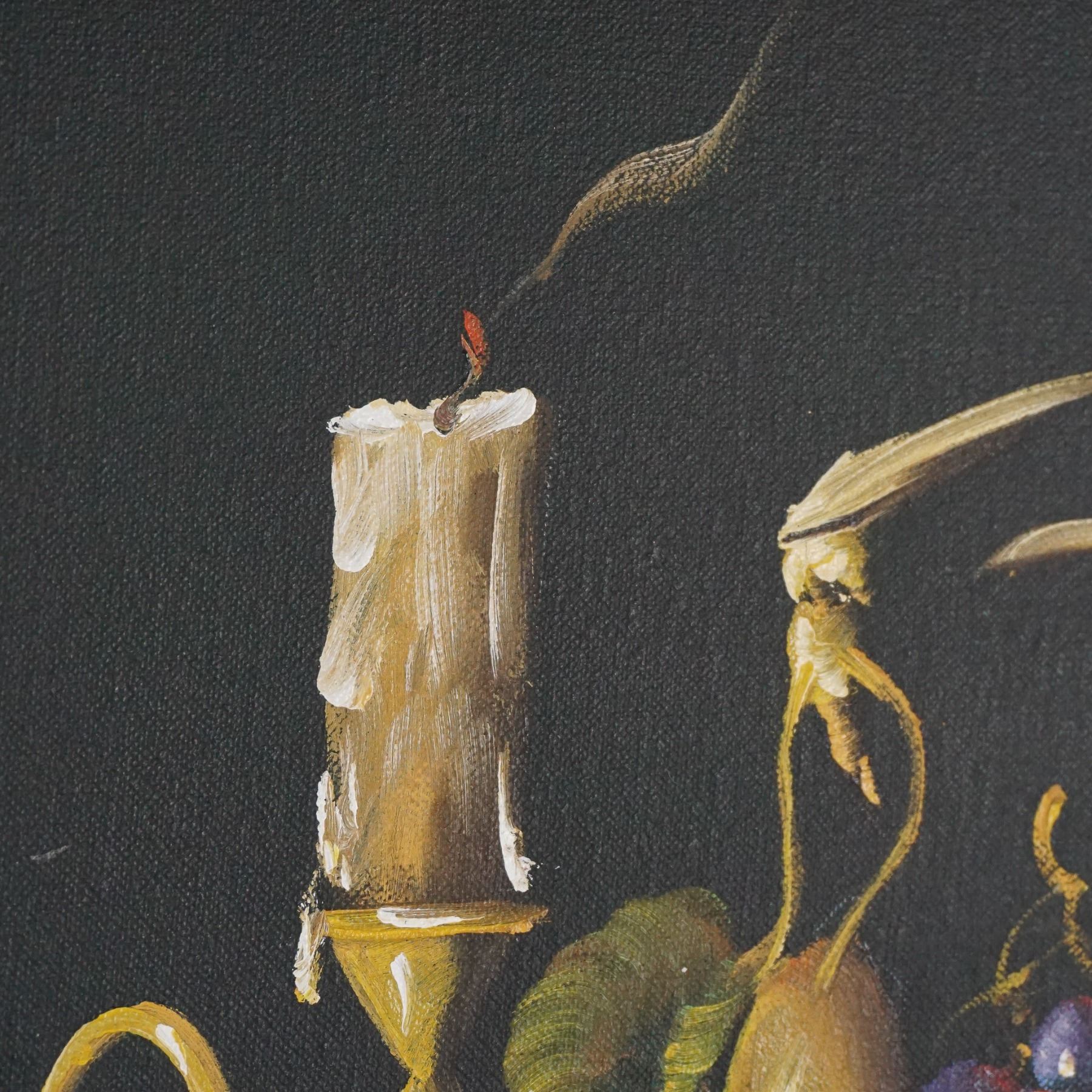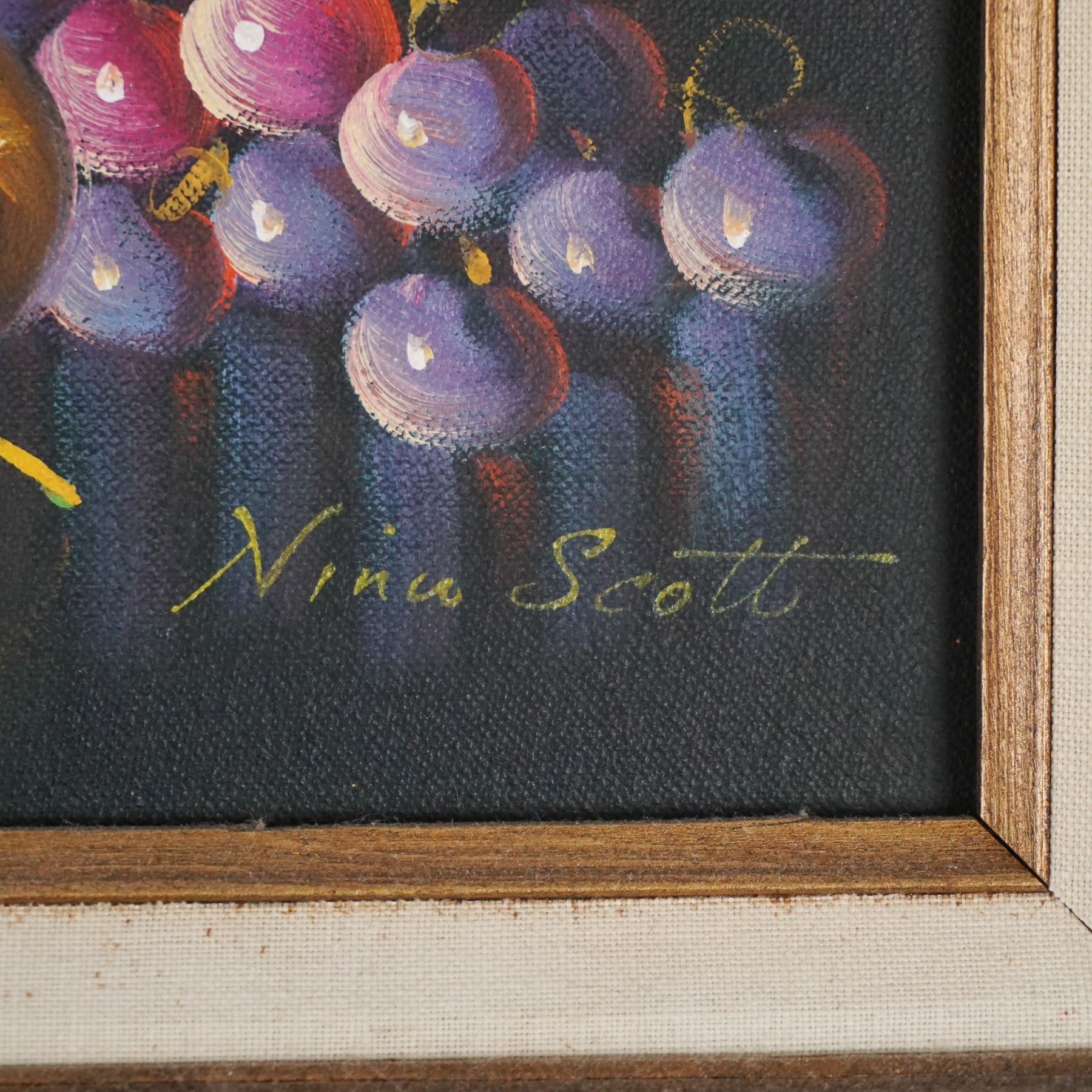 A beautifully executed still life painting by artist Nina Scott. This work features an intricate arrangement of golden pears, red cherries, and ripe purple grapes, accentuated by a burning candle and a dark reflective background. The striking composition highlights the artist's skill in capturing light, texture, and vibrant color contrasts. Nina Scott is recognized for her detailed still life compositions that celebrate the vibrancy of natural elements. Her work is highly regarded for its realism and use of dramatic lighting. Signed prominently in the lower right corner Nina Scott. Artwork dimensions with frame: 23"L x 19"H x 1.75"W.