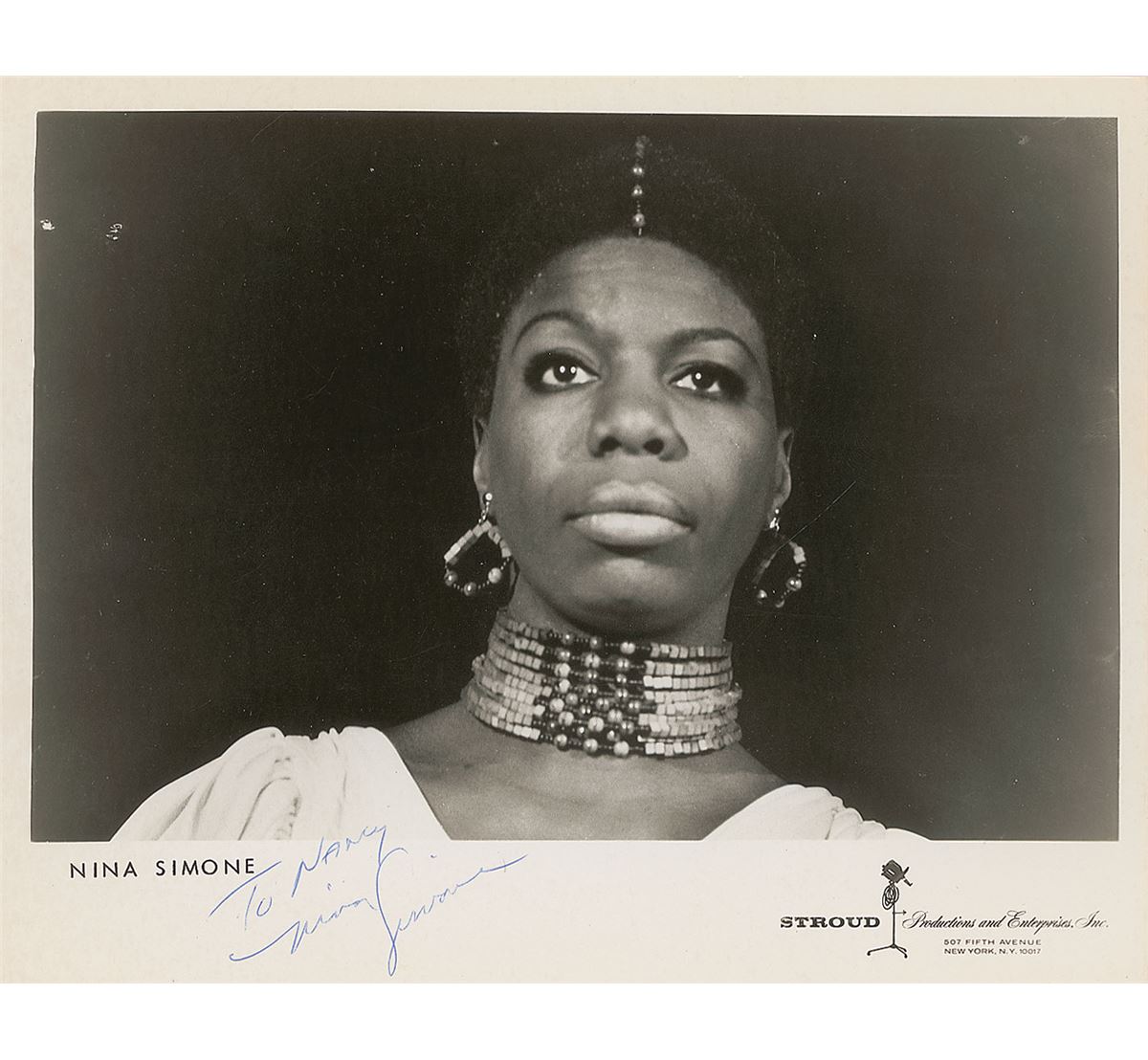 Singer, songwriter, pianist, arranger, and civil rights activist widely associated with jazz music (1933–2003). Uncommon vintage glossy 10 x 8 Stroud Productions publicity photo of Simone adorned with unique jewelry, signed and inscribed in the lower border in blue ballpoint, “To Nancy, Nina Simone.” In fine condition.