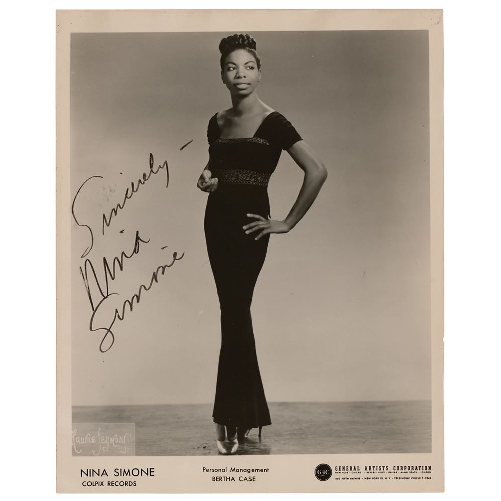 Glossy 8 x 10 Colpix Records publicity photo of Simone in a lovely full-length pose wearing a long black dress, signed in black felt tip, "Sincerely—Nina Simone." In fine condition.