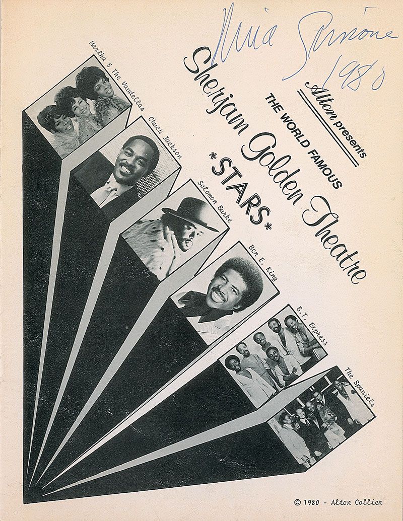 Singer, songwriter, pianist, arranger, and civil rights activist widely associated with jazz music (1933–2003). Program for Sherijam Golden Theatre shows in 1980, 8.5 x 11, signed on the front cover in blue ballpoint, “Nina Simone, 1980.” In fine condition.