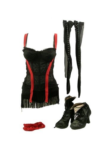 Just released from archives is the Academy Award nominated movie, Nine (2009)! This is Dancer Ilavria's screen worn, hero, black lace with red striping and straps, floral print lace on the front, multiple clips on the back, built in bra, custom made corset dance top, black stretch nylon with black frays, elastic waist bottoms, red cloth piece, black mesh with ties on the back elastic waist band on the top leggings, and worn and used black leather lace up the front, 'LaDuca' oxford style boots with heels. (size 39 1/2, 'Ilavria' written inside)