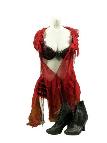 Just released from archives is the Academy Award nominated movie, Nine (2009)! This is Dancer's screen worn, hero, red and orange cloth with black stitching, self tie on the front, tattered on the bottom custom made dress, black lace with red floral print, shoulder straps with clips in the back bra, black and red lace with bow in the front bottoms, (no size, 'Irina' written inside) black lace 'Victoria's Secret' bottoms, and black leather lace up the front with cap toe 'Made in Spain' boots with heels. ('Gemma' written inside)