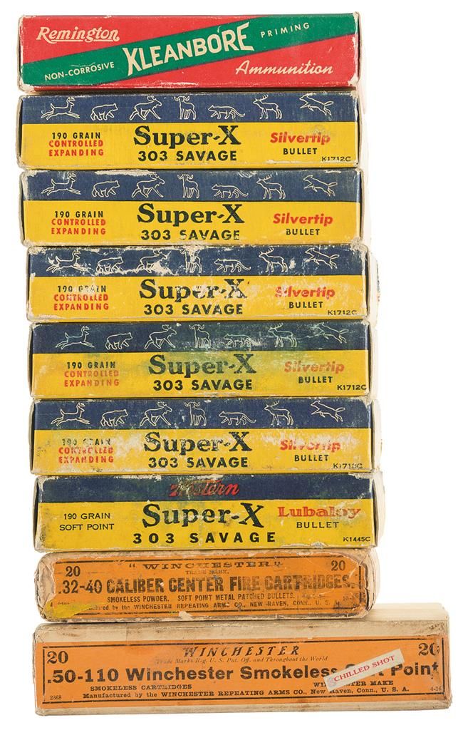 This lot includes: Six twenty round boxes of Western Super X 190 grain silvertip 303 Savage cartridges. One twenty round box of Winchester 32-40 soft point center fire cartridges. One twenty round box of Winchester .50-110-300 smokeless #8 chilled shot cartridges and one 20 round box of Remington Kleanbore 180 grain soft point 303 Savage cartridges. Good with the boxes showing some edge and corner wear.