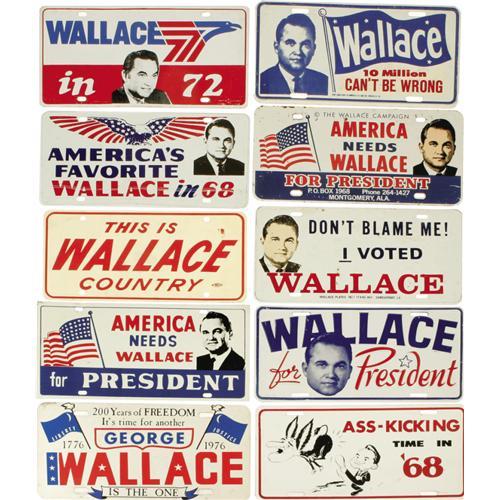 <B>Nine Different George Wallace License Plates</B></I> including some scarce varieties. The overall condition of these plates is excellent. Looking through them, you get a sense of his bids for the presidency which took place in '64,'68, '72 and '76.<BR><BR><b>Shipping:</b> Small Collectibles (<a target="_blank" href="http://www.heritageauctions.com/common/shipping.php">view shipping information</a>)