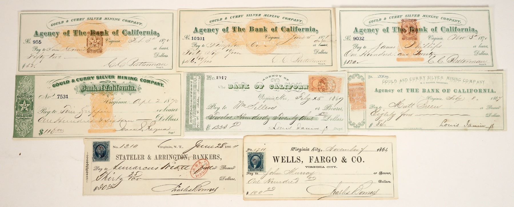 Lot of 9 different. All Gould & Curry. Nice group that spans over a decade for this mine. Includes: 1861 Wells Fargo signed by Charles Strong;1864 Wells Fargo signed by Charles Bonner; 1864 Stateler & Arrington signed by Bonner, with red bank cancel; 1867 "dripping letters" style signed by Louis Janin w/NV revenue stamp; different 1867 signed by Janin with NV stamp; 1870 signed by Isaac Requa with RN-B and printed green NV stamp; 1870 with rare RN-B17b, signed by CC Batterman; 1871 signed by Batterman, RN-C; and 1872 signed by Batterman with rare RN-C21b. Instant collection!
