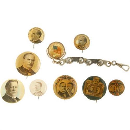 <B>Nine Early 20th Century Campaign Buttons,</B></I> including: three William McKinley buttons; Three McKinley & Roosevelt Jugate Buttons; one Theodore Roosevelt button; one William Howard Taft button; and, a William McKinley watch fob. Various sizes. Most are stained. A nice lot.<BR><BR><b>Shipping:</b> Miscellaneous Collectibles, Smal (<a target="_blank" href="http://www.heritageauctions.com/common/shipping.php">view shipping information</a>)