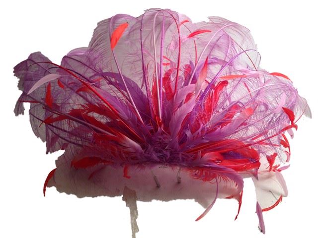 Female dancer, screen worn, feather headpiece with purple and red feathers and jewel accents, this has a piece of tape on the headpiece that reads "Claire".(28x21)
