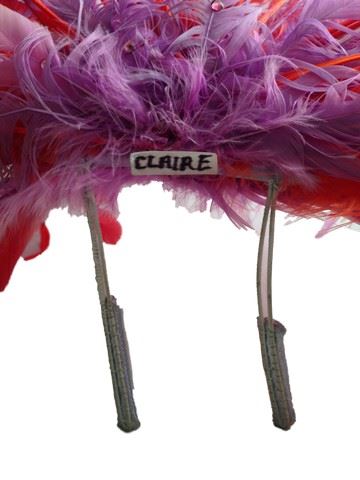 Female dancer, screen worn, feather headpiece with purple and red feathers and jewel accents, this has a piece of tape on the headpiece that reads "Claire".(28x21)