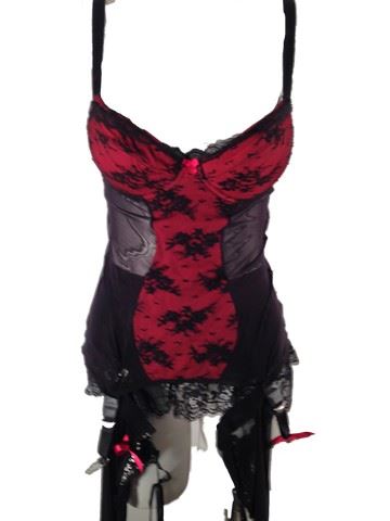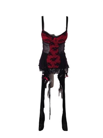 Female Dancer, screen worn, hero, custom made costume. Includes a red and black lace body stocking with clip on thigh high attachments, black lace up the back stockings that stop at the ankle, black satin and lace outergarment.