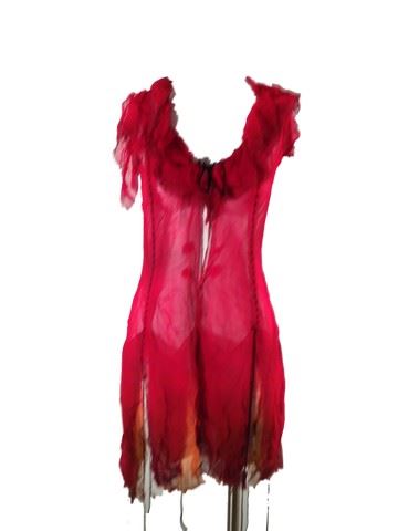 Female Dancer, screen worn, hero, red see through chiffon dress open in the front with black stitching and ties, bottom half of the dress is shredded for a peek-a-boo affect.