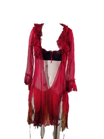 Female Dancer's screen worn, hero, red see through chiffon dress open in the front with black stitching and ties. Bottom half of the dress is shredded for a peek-a-boo effect. Lace black and red, padded bra included and worn under the dress exposed. Also includes black lace up ankle boots with a heel.