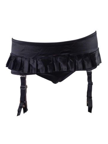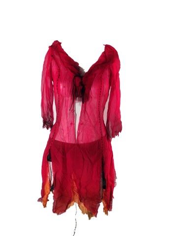Female Dancer screen worn, hero, red see-through chiffon dress open in the front with black stitching and ties. Bottom half of the dress is shredded for a peek-a-boo effect. Includes black satin panties with built in garter straps with ruffled design and, black fish net stockings.
