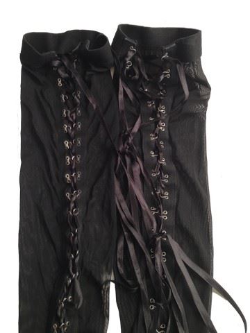 Female Dancer screen worn, hero, red and black lace bodice with red stitching accents. The bodice has been torn on the left side at the bottom of the dress. Includes a red satin and lace bra sewn into the bodice, black lace up stockings and black fishnet stockings with black lace up ankle boots.
