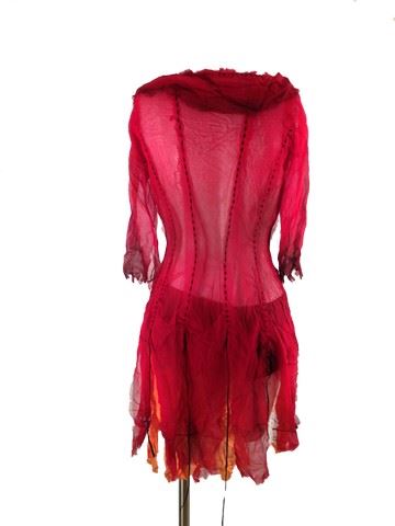 Female Dancer screen worn, hero, red see-through chiffon dress open in the front with black stitching and ties. Bottom half of the dress is shredded for a peek-a-boo effect. Includes black satin panties with built in garter straps with ruffled design and, black fish net stockings.