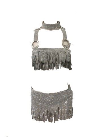 Female Dancer (Ilaria Cavola) screen worn, hero, silver sparkle tassel and circle design with snaps in the back custom made dancer top, dancer skirt with sparkle silver embossed fringe design, 4 silver bracelets.