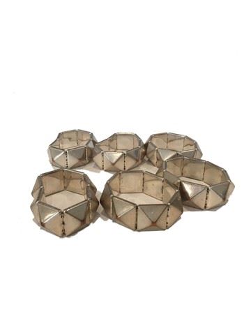 Female Dancer (Ilaria Cavola) screen worn, hero, silver sparkle tassel and circle design with snaps in the back custom made dancer top, dancer skirt with sparkle silver embossed fringe design, 4 silver bracelets.