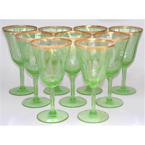 <tr><td><font size="2" face="Arial, Helvetica, sans-serif"><strong><font color="#000033">Title:</font></strong>Nine Green Depression Glass Gold Trim Goblets</font></td></tr>