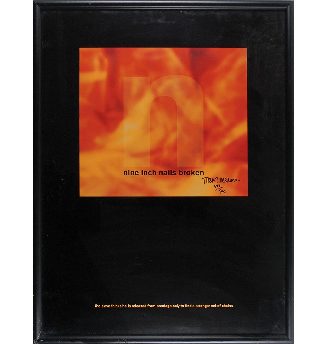 Color limited edition 23.5 x 31.5 print of the band’s artwork for their Broken album, numbered 544/999, signed in black felt tip. Framed to an overall size of 25.5 x 33.5. In fine condition.