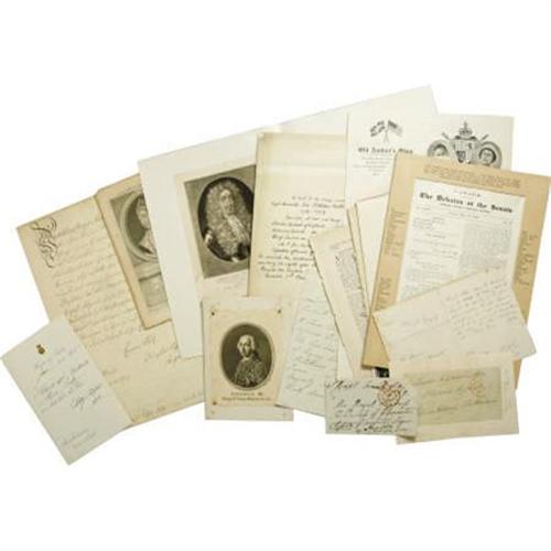 <B>Nine Items Pertaining to British Nobility,</B></I> as follows:<BR><B>Princess Augusta LS,</B></I> one page (in German), 8" x 12.5", Leicester House, January 8, 1754, to her brother Friederich, Duke of Saxony.<BR><B>Sir Fletcher Norton ALS,</B></I> "<I>F V Norton,</B></I>", one page, London, January 22, 1779, recipient unknown.<BR><B>Engraved Portrait of Henry, Duke of Norfolk,</B></I> (London: S. Woodburn, 1810), 5" x 7.25.<BR><B>Lady Anne Hamilton Autograph Letter (unsigned),</B></I> two pages, 4.5" x 7.5", November 14, 1820. <BR><B>Duke of Sussex DS,</B></I> "<I>Sussex</B></I>", 4.5" x 3", London, March 8, 1839. A letter's address panel endorsed by a son of King George III.<BR><B>Princess Sophia Autograph Letter (unsigned),</B></I> one page, 3.5"x 5", Windsor Castle, November 2, 1814.<BR><B>Prince William Frederick, DS,</B></I> 4.75" x 3"”, London, July 16, 1830.<BR><B>Partially Printed House of Lords Pass,</B></I> 4.25"x 7", January 2, 1875.<BR><B>Canadian Imprint Containing George VI's Speech,</B></I> two pages, 8vo, May 19, 1939, with first day cover. Items average fine condition. <I>From the collection of Henry E. Luhrs.</B></I><BR><BR><b>Shipping:</b> Flat Material, Small (<a target="_blank" href="http://www.heritageauctions.com/common/shipping.php">view shipping information</a>)